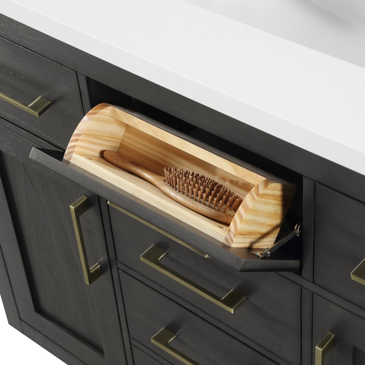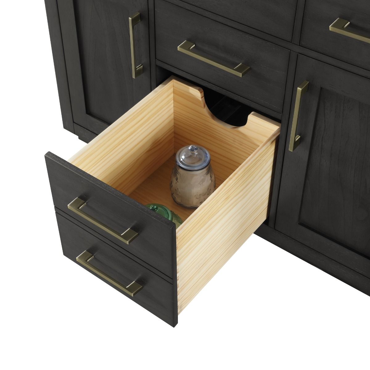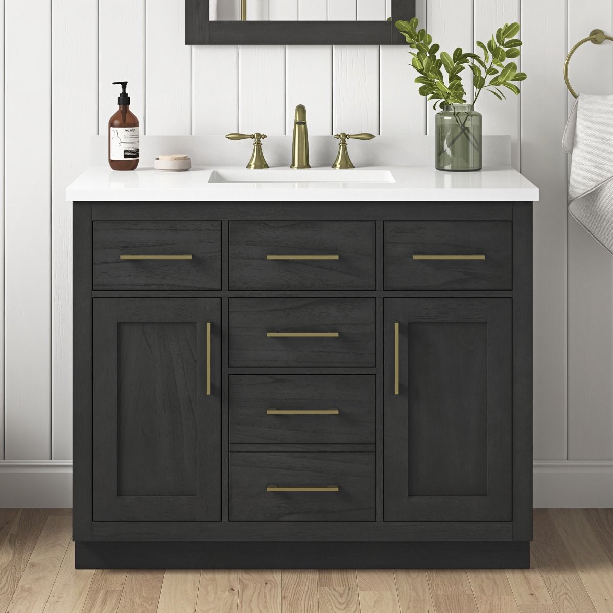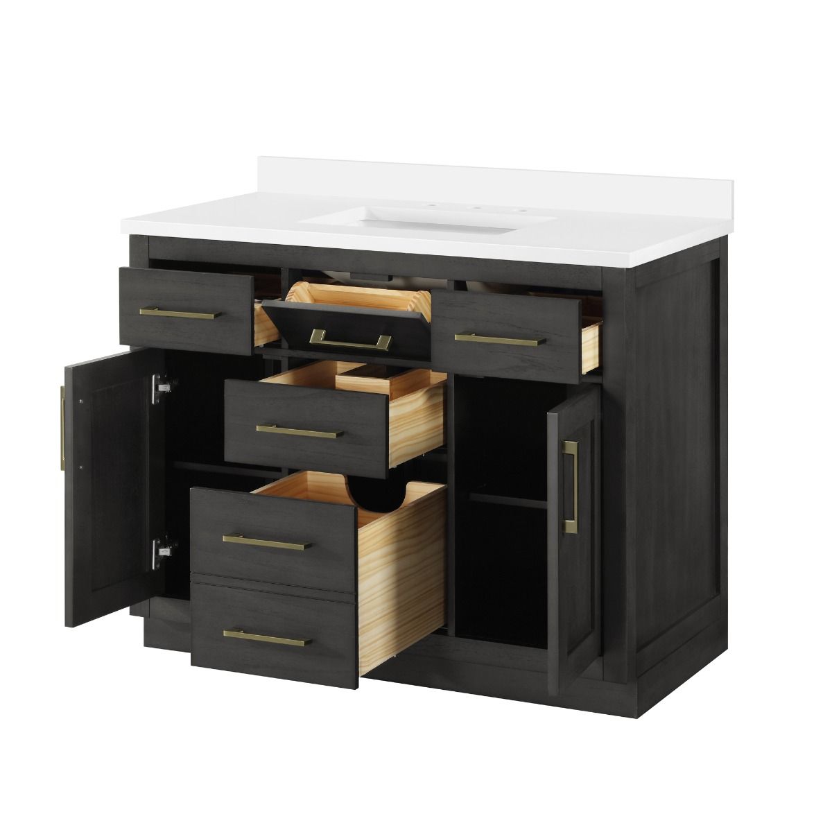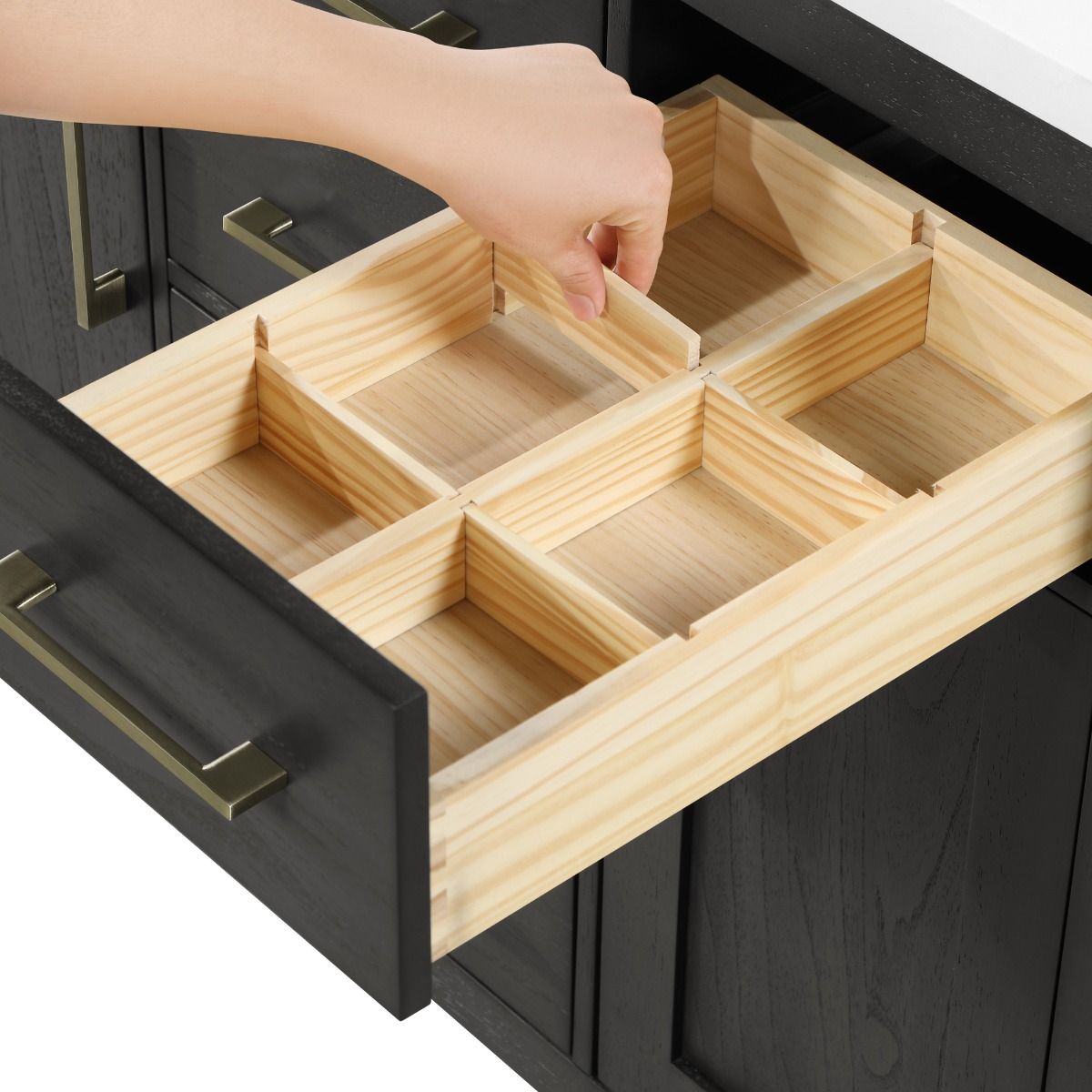 Profitez d'équipements modernes et d'un espace de rangement optimisé grâce au meuble-lavabo Alonso de 107 cm de large, disponible en finition Blanc, Bleu Nuit ou Bois d'Ébène Foncé par OVE Decors. Son élégant plan de travail en pierre reconstituée blanche à bords droits, son lavabo rectangulaire sous plan et son dosseret assorti de 7,6 cm de haut sont faciles à nettoyer et conçus pour durer. Deux armoires à portes simples, à panneaux de style Shaker, dévoilent deux étagères réglables en hauteur. Un tiroir supérieur inclinable, trois tiroirs classiques, dont deux avec séparateurs réglables astucieux, et un tiroir inférieur double profond, tous à fermeture amortie, vous permettront de ranger et d'organiser tous vos essentiels de salle de bains.