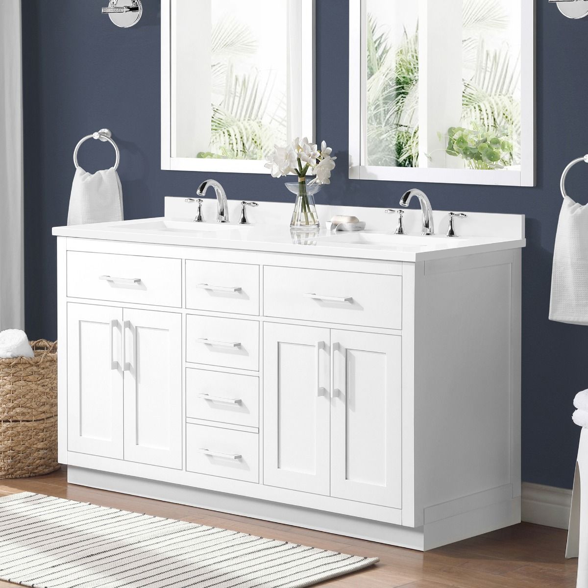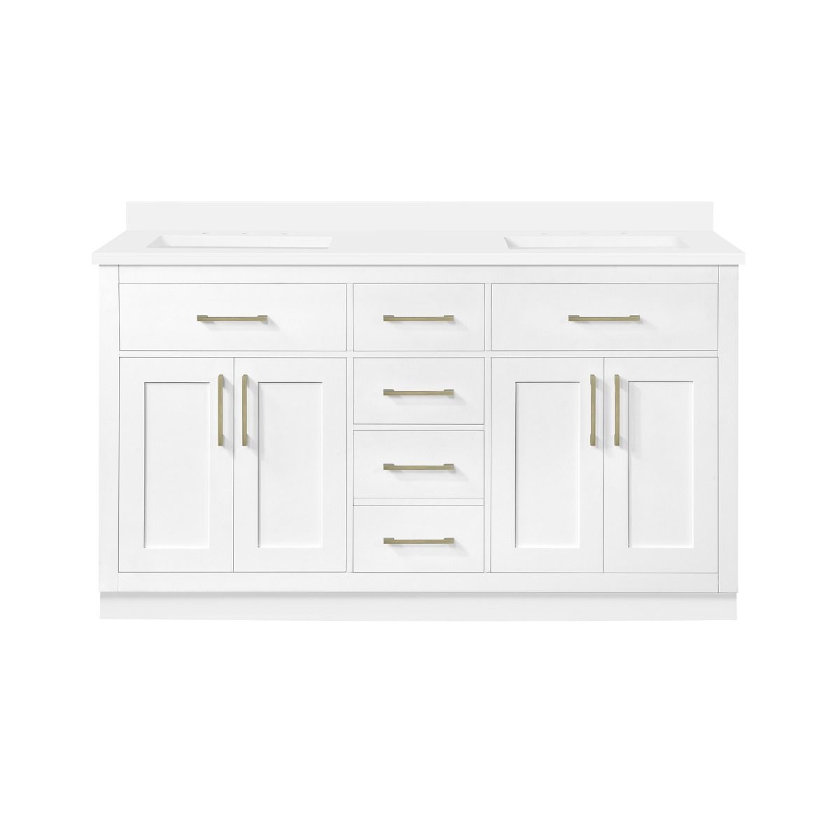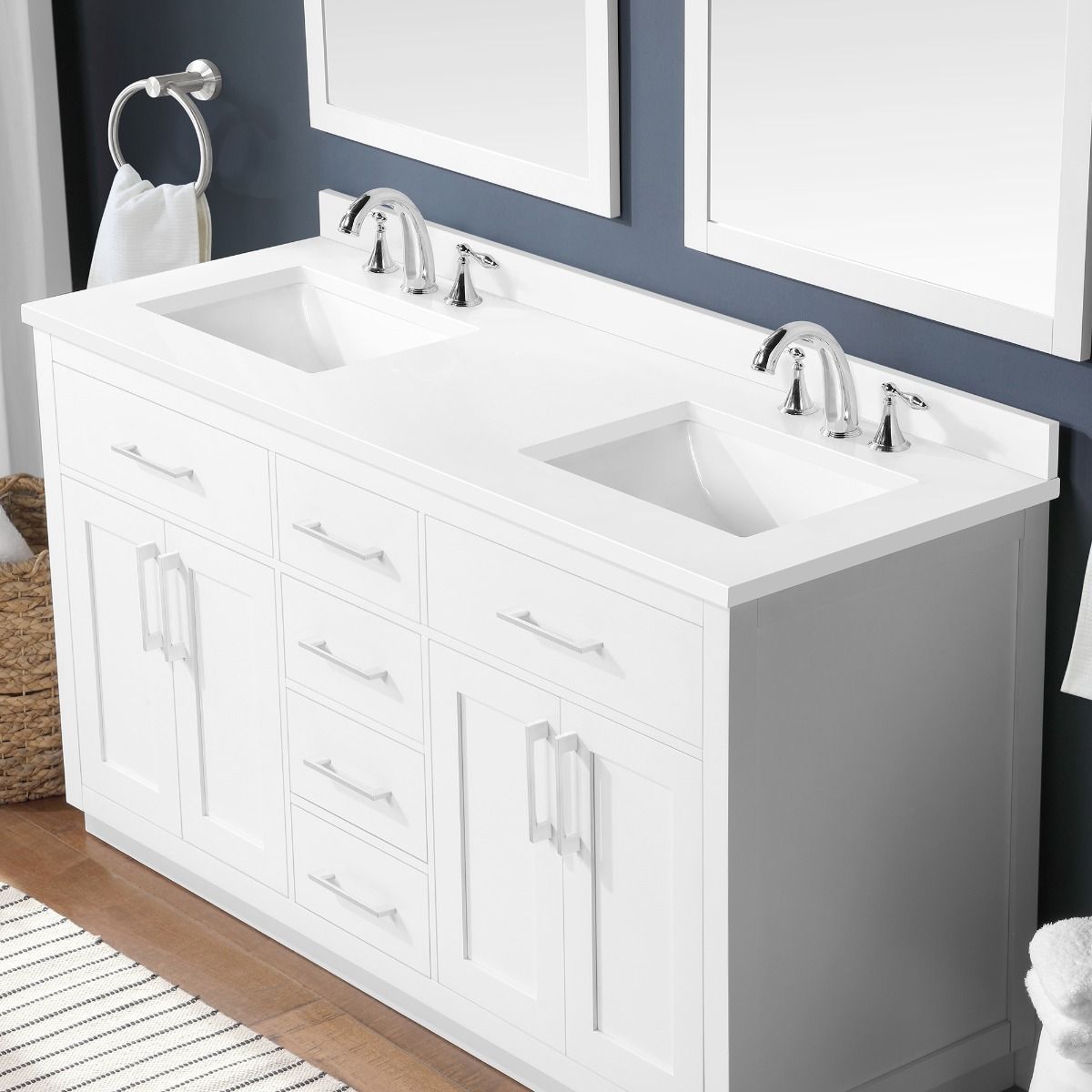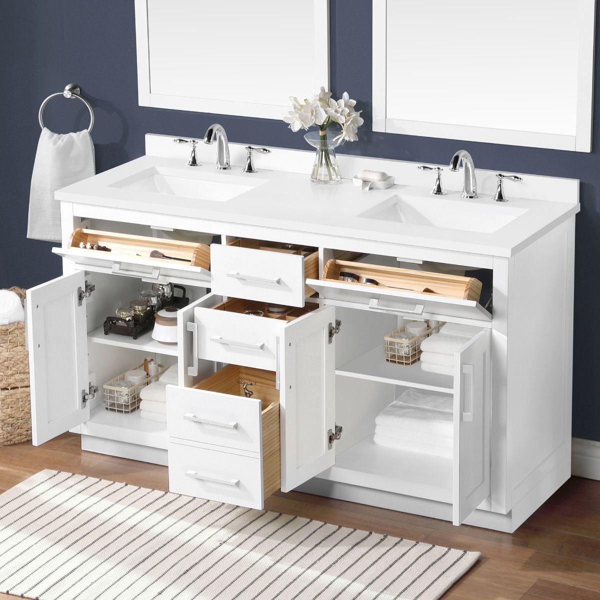 Find modern amenities and every inch of storage space maximized in the Alonso 60-inch wide double vanity in pure white by OVE Decors. A handsome white straight edge engineered stone counter complete with two undermount rectangular sinks and matching 3-inch high backsplash is easy to clean and ready for years of use. Two double door Shaker panelled cabinets reveal an adjustable height shelf plus a pull-out shelf complete with hair styling tool compartment holders and a built-in power strip with sockets and USB ports. Two tilt-down top drawer, two regular drawers and a double deep bottom drawer with clever separator compartments and soft-close dovetailed construction keep all your bathroom essentials tidy and organized.