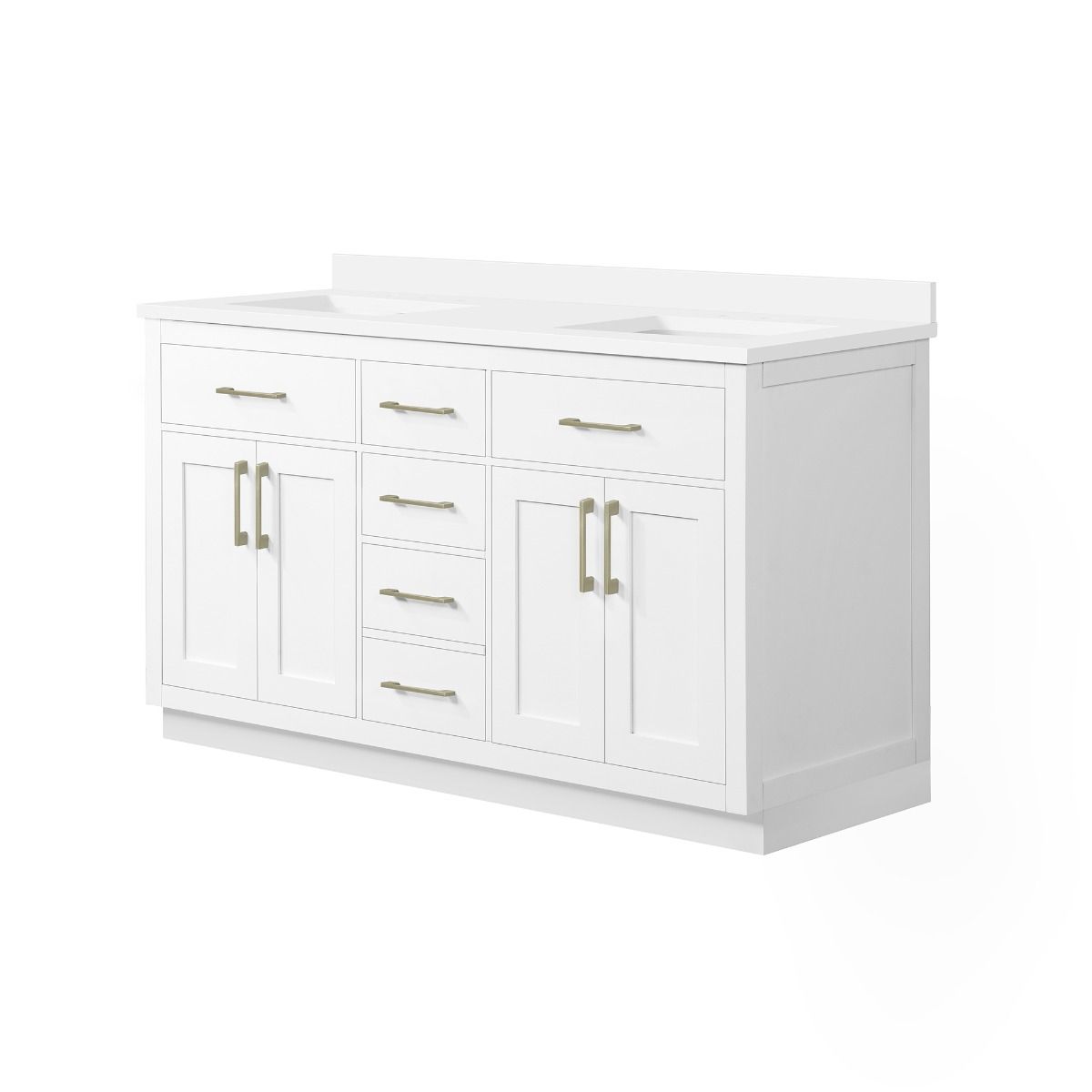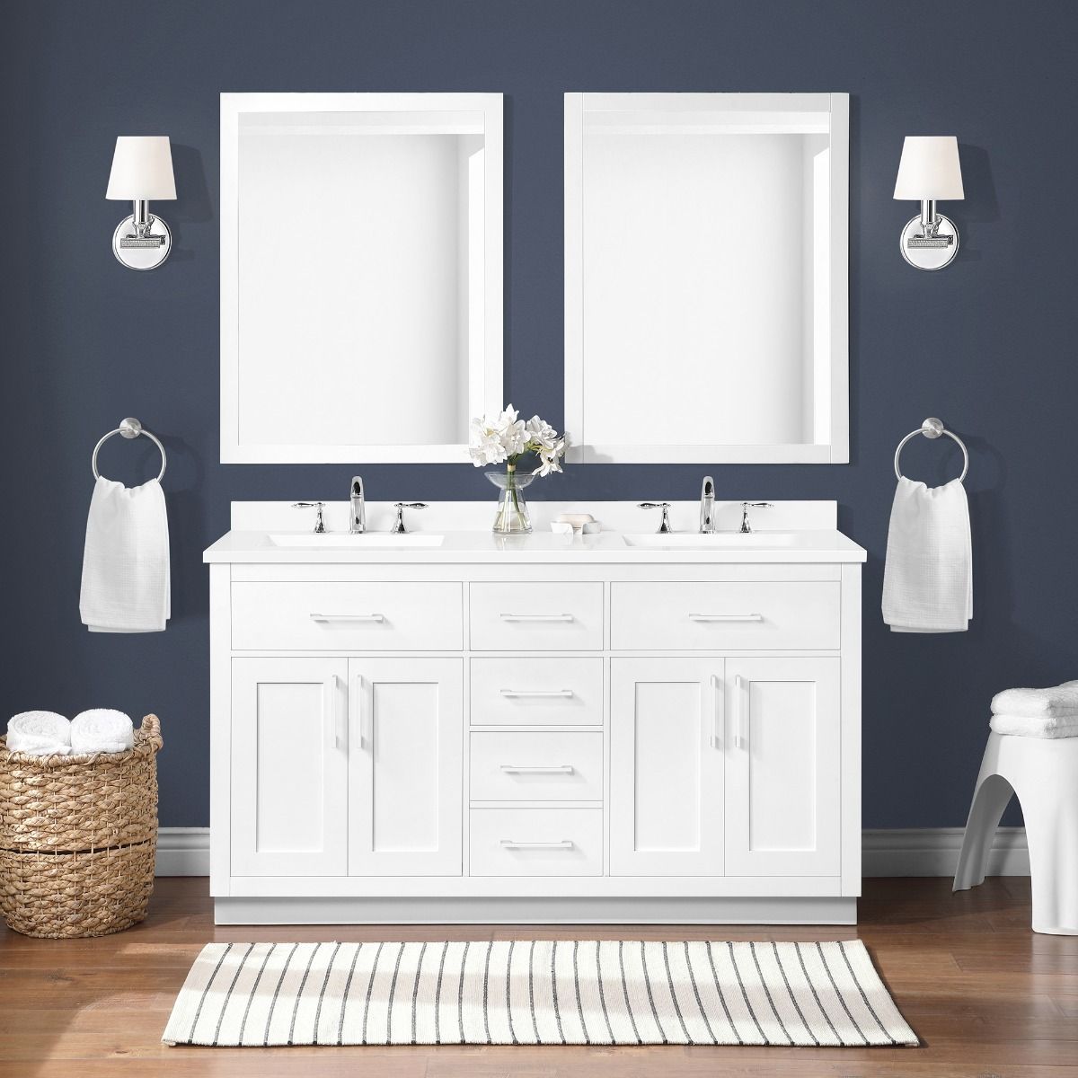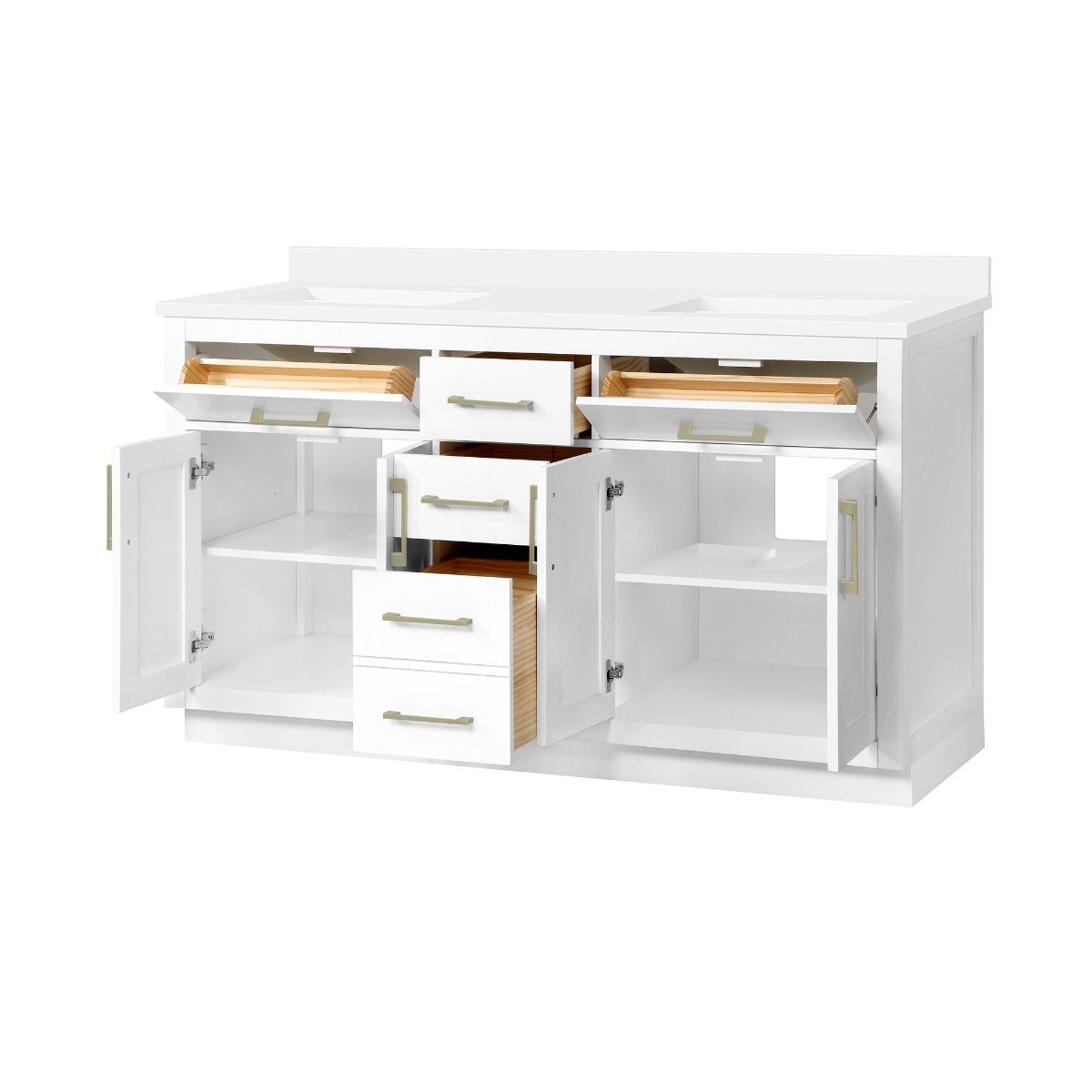 Find modern amenities and every inch of storage space maximized in the Alonso 60-inch wide double vanity in pure white by OVE Decors. A handsome white straight edge engineered stone counter complete with two undermount rectangular sinks and matching 3-inch high backsplash is easy to clean and ready for years of use. Two double door Shaker panelled cabinets reveal an adjustable height shelf plus a pull-out shelf complete with hair styling tool compartment holders and a built-in power strip with sockets and USB ports. Two tilt-down top drawer, two regular drawers and a double deep bottom drawer with clever separator compartments and soft-close dovetailed construction keep all your bathroom essentials tidy and organized.