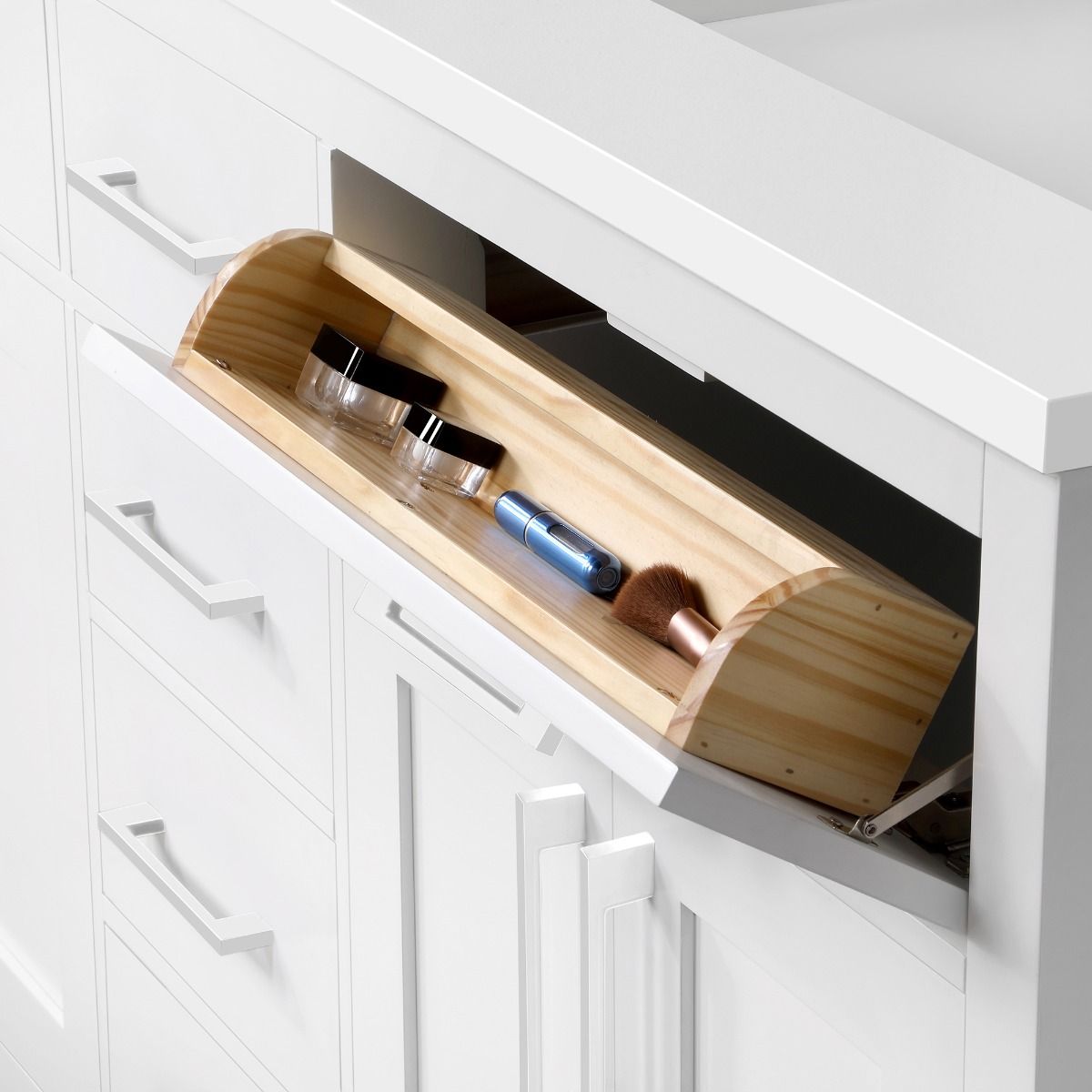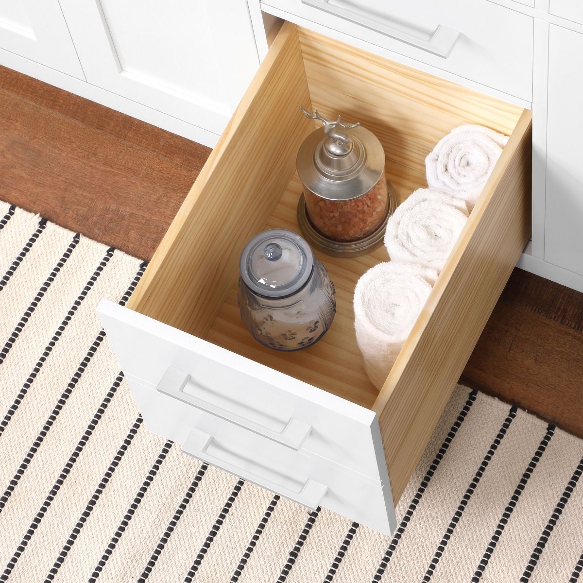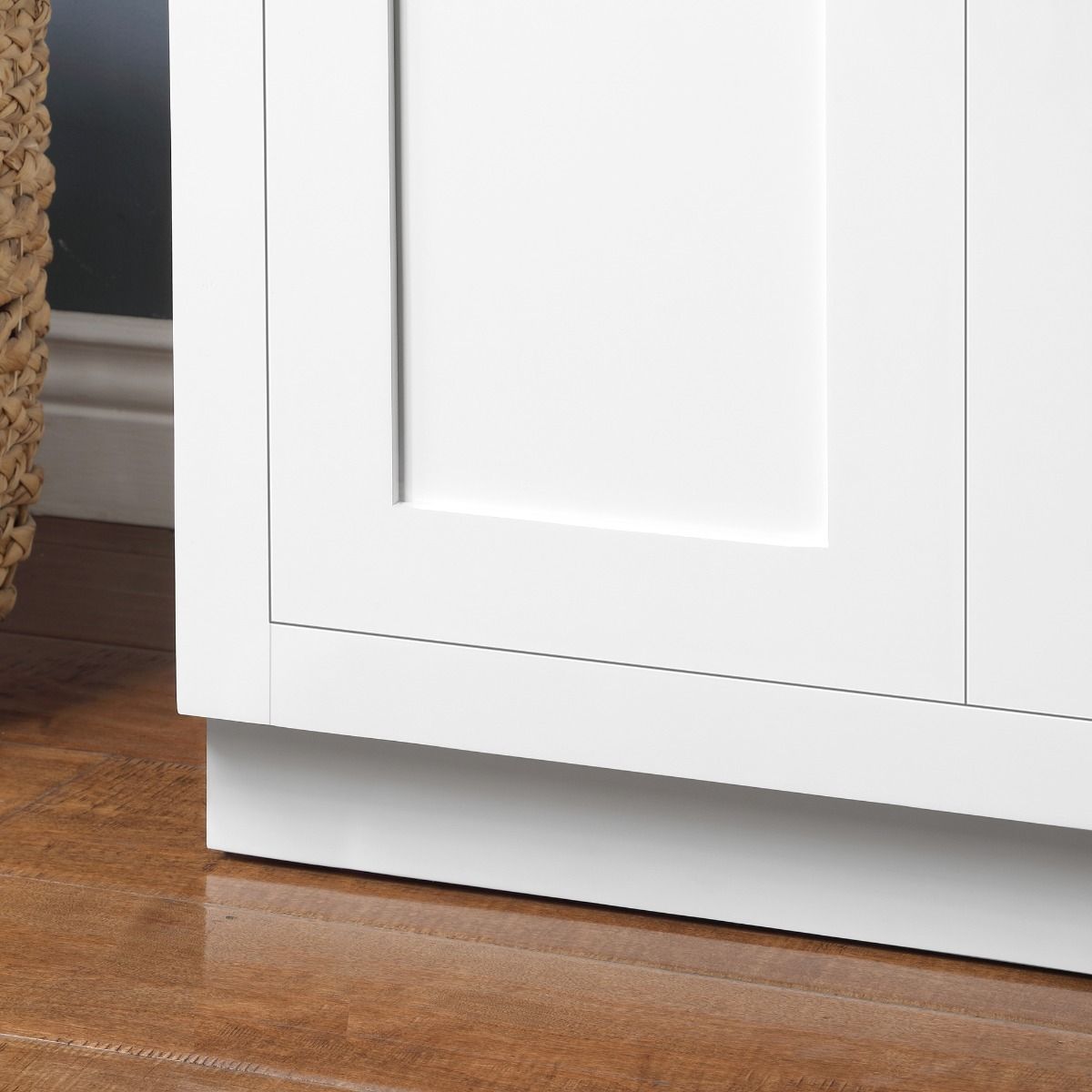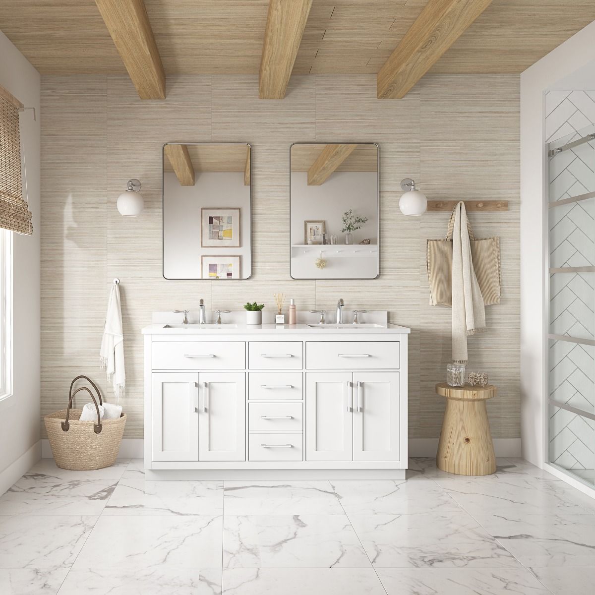 Find modern amenities and every inch of storage space maximized in the Alonso 60-inch wide double vanity in pure white by OVE Decors. A handsome white straight edge engineered stone counter complete with two undermount rectangular sinks and matching 3-inch high backsplash is easy to clean and ready for years of use. Two double door Shaker panelled cabinets reveal an adjustable height shelf plus a pull-out shelf complete with hair styling tool compartment holders and a built-in power strip with sockets and USB ports. Two tilt-down top drawer, two regular drawers and a double deep bottom drawer with clever separator compartments and soft-close dovetailed construction keep all your bathroom essentials tidy and organized.
