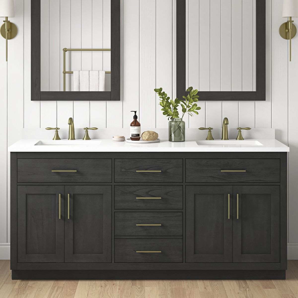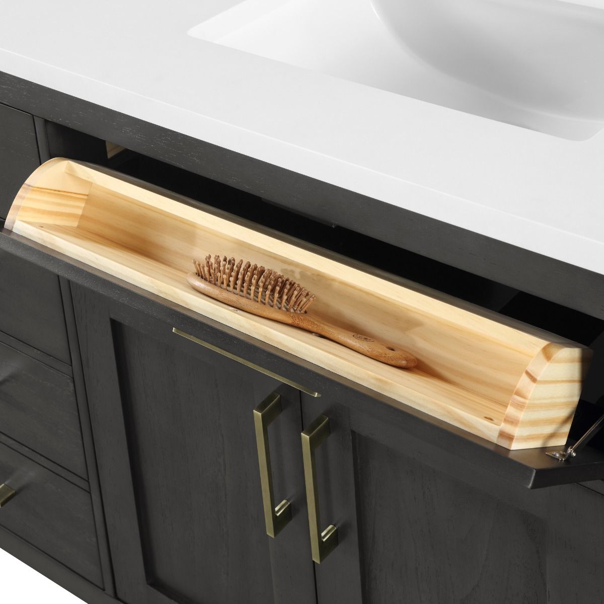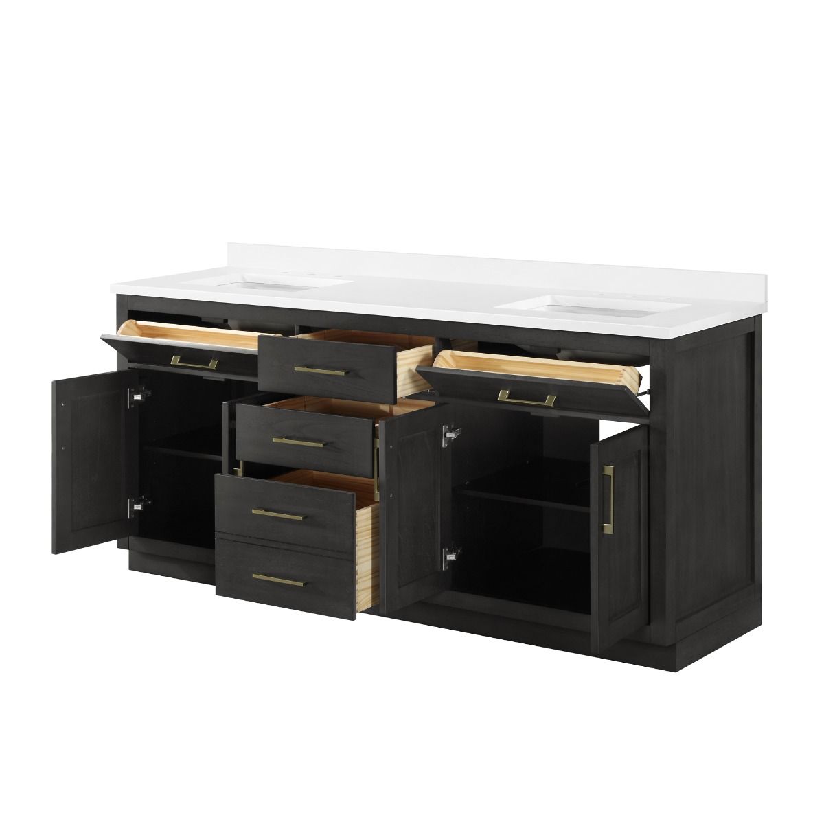 Find modern amenities and every inch of storage space maximized in the Alonso 72-inch wide double vanity in Dark Ebony Wood by OVE Decors. A handsome white straight edge engineered stone counter complete with two undermount rectangular sinks and matching 3-inch high backsplash is easy to clean and ready for years of use. Two double door Shaker panelled cabinets reveal an adjustable height shelf plus a pull-out shelf complete with hair styling tool compartment holders and a built-in power strip with sockets and USB ports. Two tilt-down top drawer, two regular drawers and a double deep bottom drawer with clever separator compartments and soft-close dovetailed construction keep all your bathroom essentials tidy and organized. With sizes ranging from a space-saving 30-inch to large double vanity models.