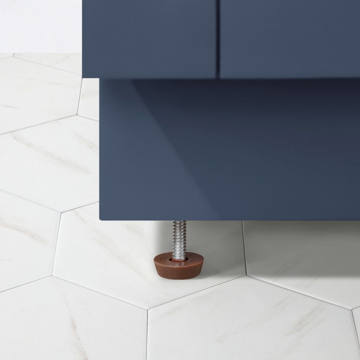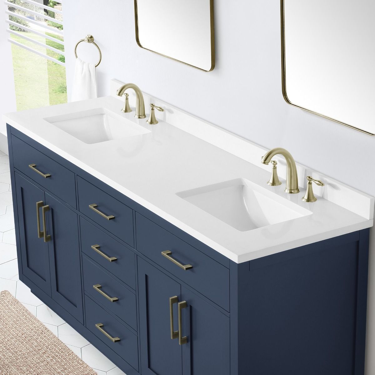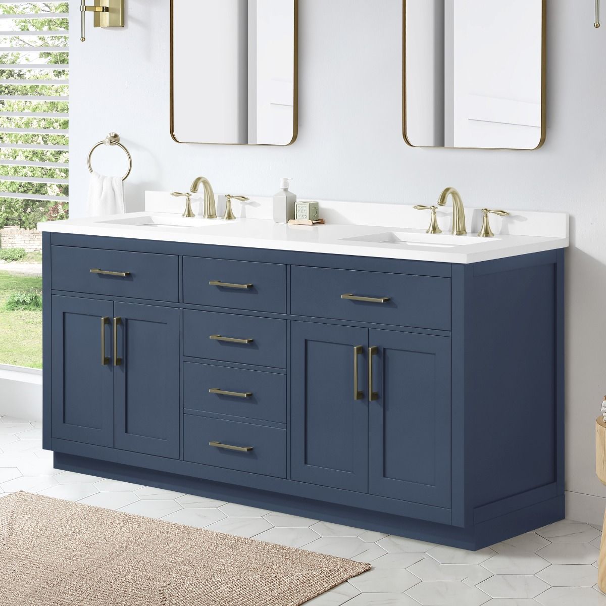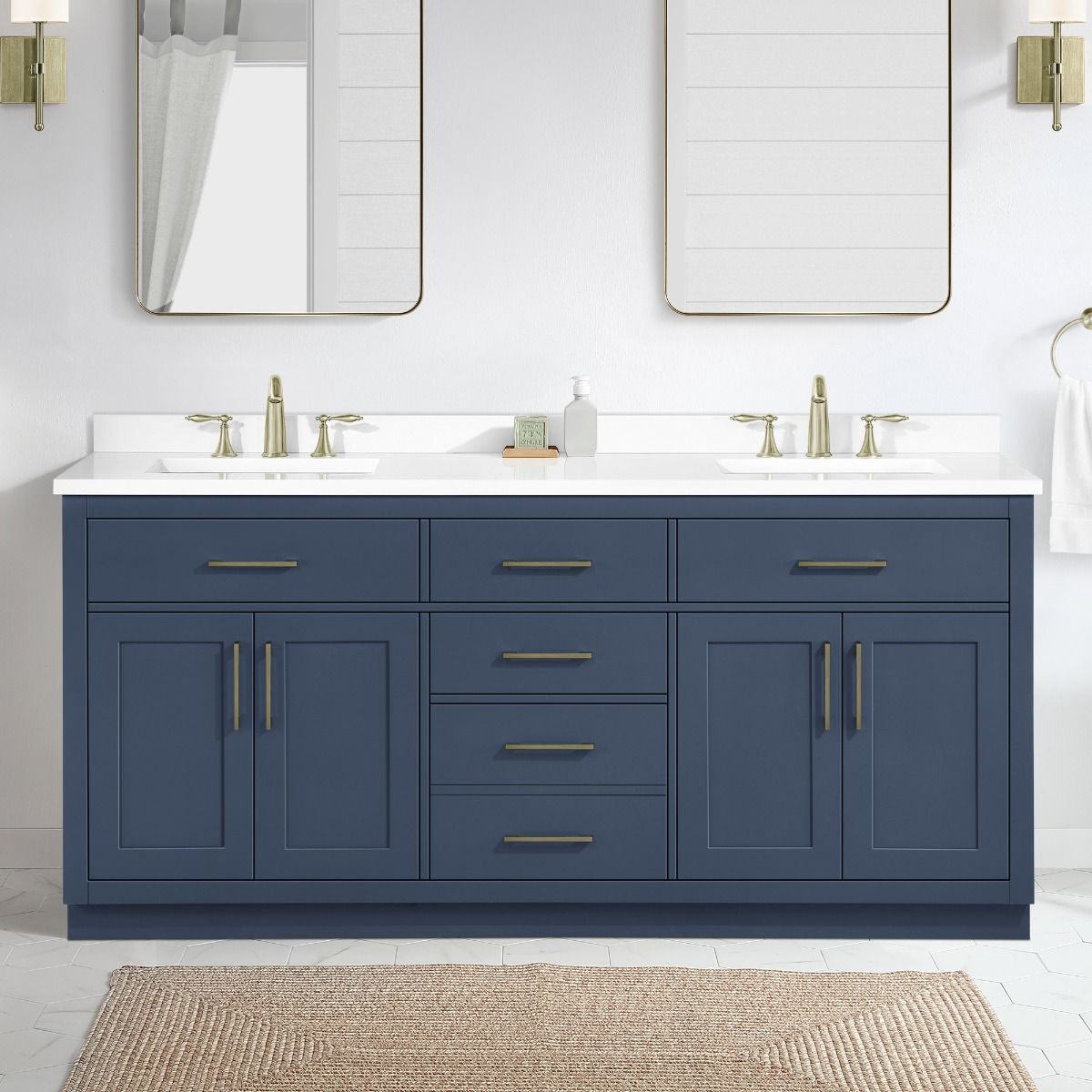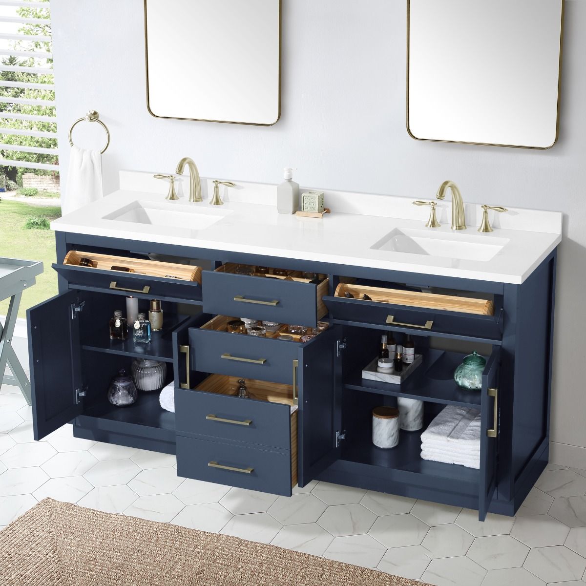 Find modern amenities and every inch of storage space maximized in the Alonso 72-inch wide double vanity in Midnight Blue by OVE Decors. A handsome white straight edge engineered stone counter complete with two undermount rectangular sinks and matching 3-inch high backsplash is easy to clean and ready for years of use. Two double door Shaker panelled cabinets reveal an adjustable height shelf plus a pull-out shelf complete with hair styling tool compartment holders and a built-in power strip with sockets and USB ports. Two tilt-down top drawer, two regular drawers and a double deep bottom drawer with clever separator compartments and soft-close dovetailed construction keep all your bathroom essentials tidy and organized. With sizes ranging from a space-saving 30-inch to large double vanity models.