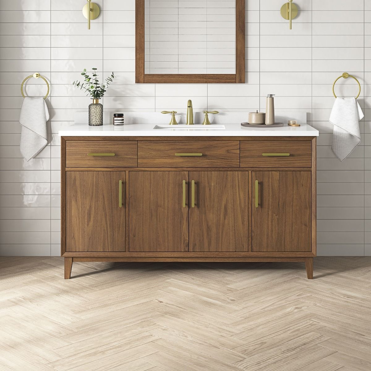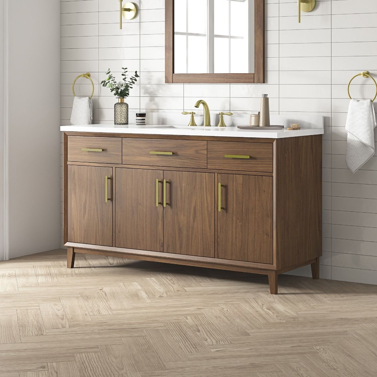 Adoptez un style transitionnel dans votre salle de bain principale ou votre salle de bain principale avec le meuble-lavabo simple autoportant Jonah de 60 po d'OVE Decors. Pour s'adapter à votre style, choisissez entre le blanc pur ou le noyer chaleureux et complétez le look avec l'un des deux ensembles de quincaillerie inclus. Une combinaison astucieuse de tiroirs et d'armoires offre un grand espace de rangement pour les produits d'hygiène quotidienne, facilitant ainsi le rangement du comptoir en quartz artificiel. Sa vasque émaillée facile à nettoyer conservera son éclat et vous aidera à créer un espace de vie frais dont vous profiterez pendant de nombreuses années.