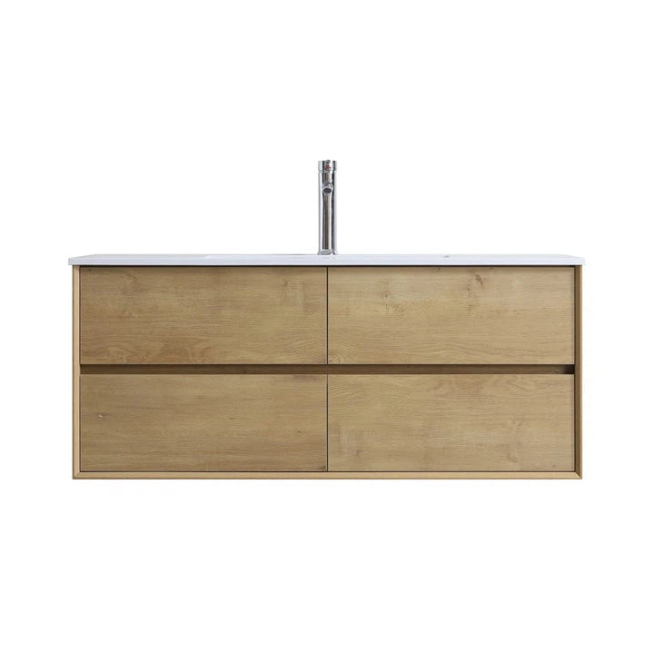 Wall Mount Vanity with natural wood colour drawers, this stylish and practical cabinet is designed to appeal to the masses with its sleek and modern aesthetic. The melamine wood grain finish gives the cabinet a natural and warm look, perfect for creating a cozy and inviting atmosphere in any bathroom. The engineered stone countertop adds a touch of luxury and sophistication, making it a perfect complement to the wood grain finish.
