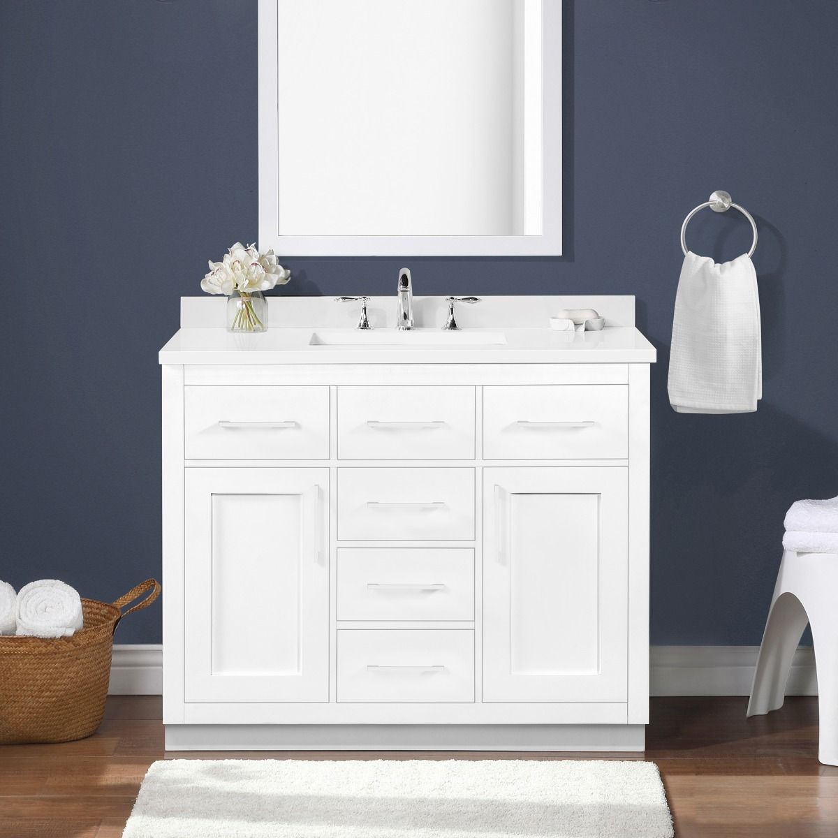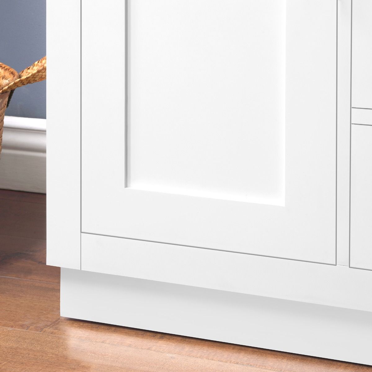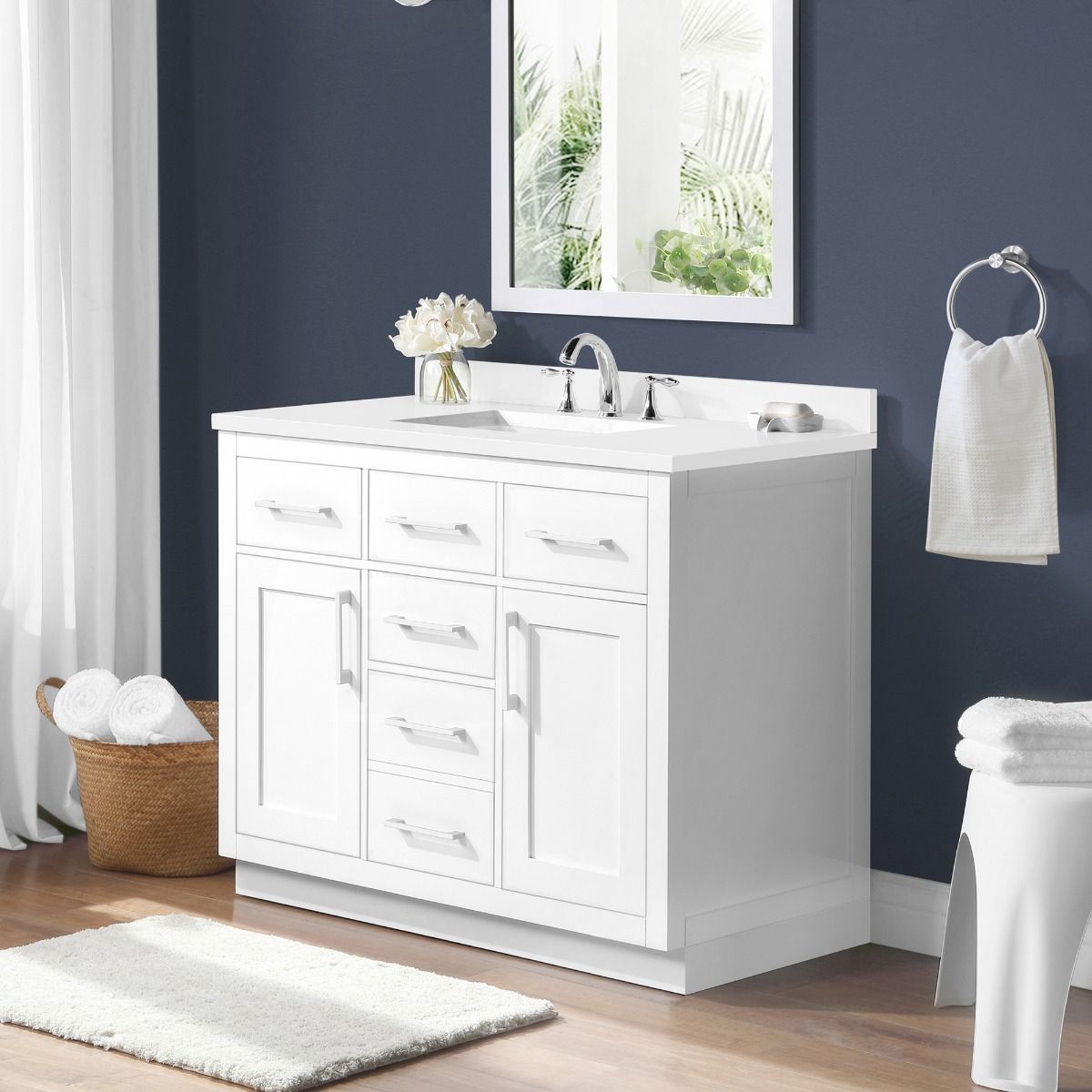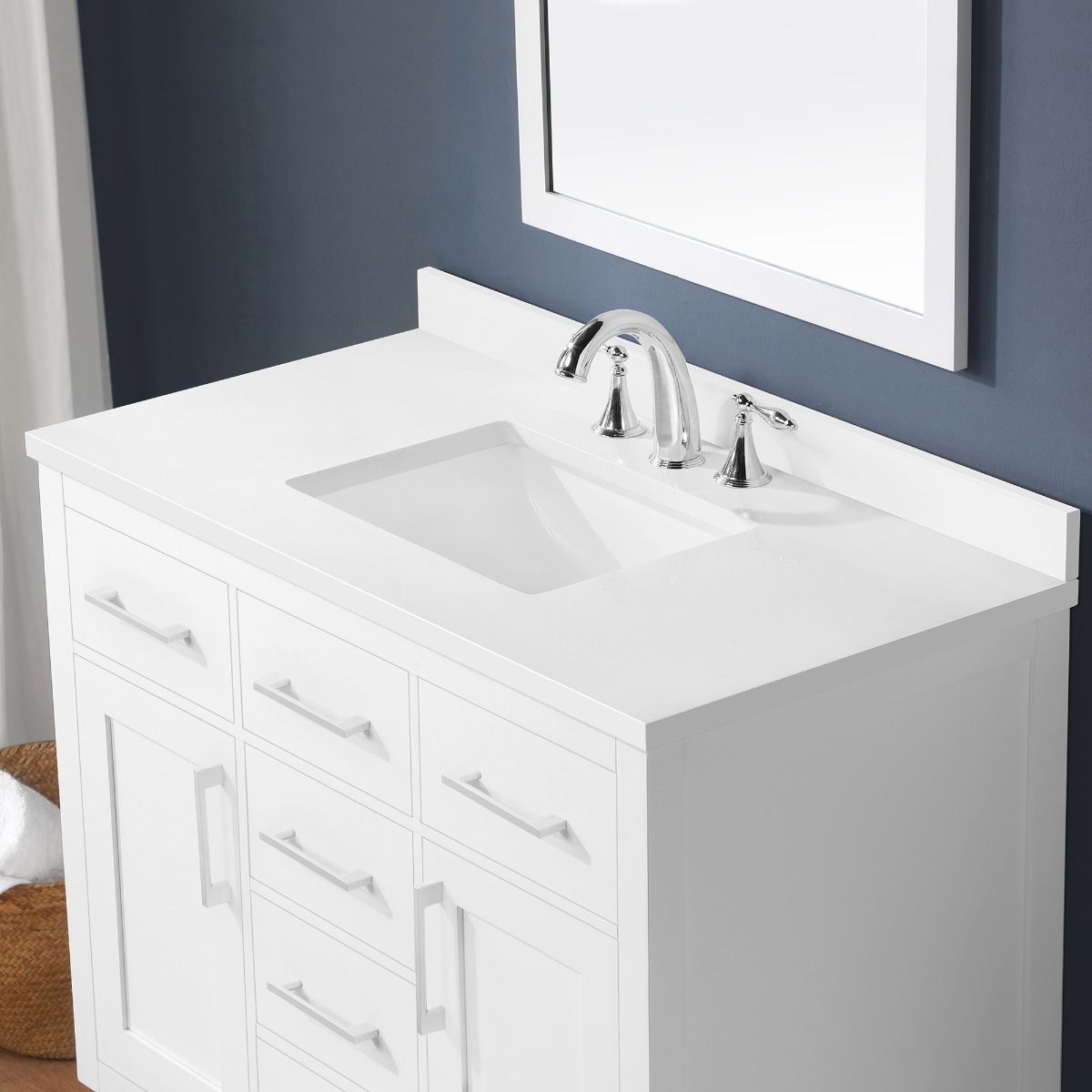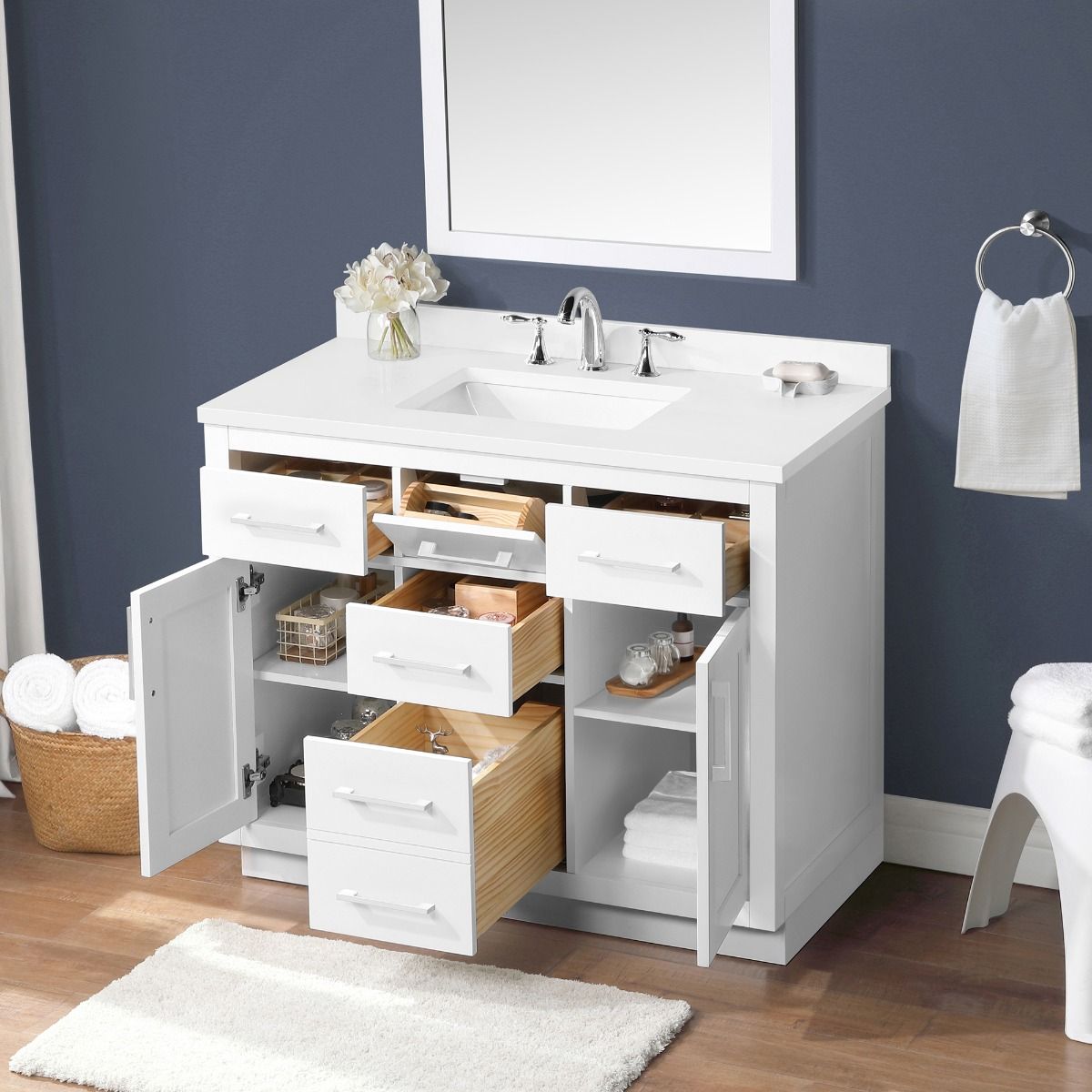 Find modern amenities and every inch of storage space maximized in the Alonso 42-inch wide vanity in pure white by OVE Decors. A handsome white straight edge engineered stone counter complete with an undermount rectangular sink and matching 3-inch high backsplash is easy to clean and ready for years of use. Two single door Shaker panelled cabinets reveal an adjustable height shelf . A tilt-down top drawer, two regular drawers and a double deep bottom drawer with clever separator compartments and soft-close dovetailed construction keep all your bathroom essentials tidy and organized.