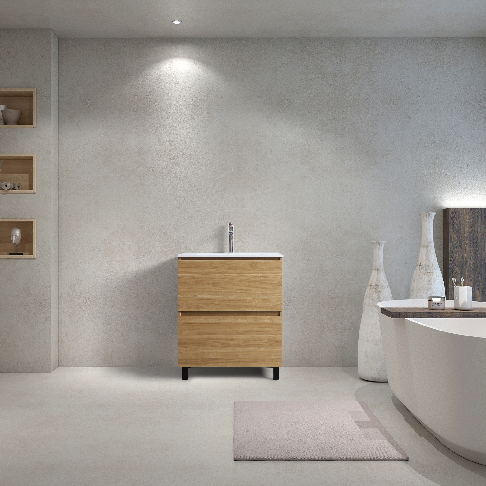 This honey brown coloured vanity has beautiful modern styling that complements any bathroom it is a practical Floor-Standing Design that requires minimal assembly, concealed soft-close door hinges and recessed toe kick. Its doors are 45° oblique, invisible handle and has plenty of storage and counter space; it is also open, easy-access storage spaces.