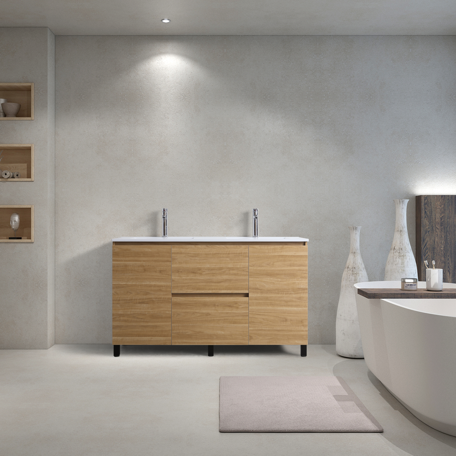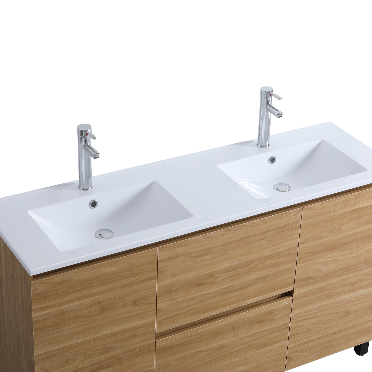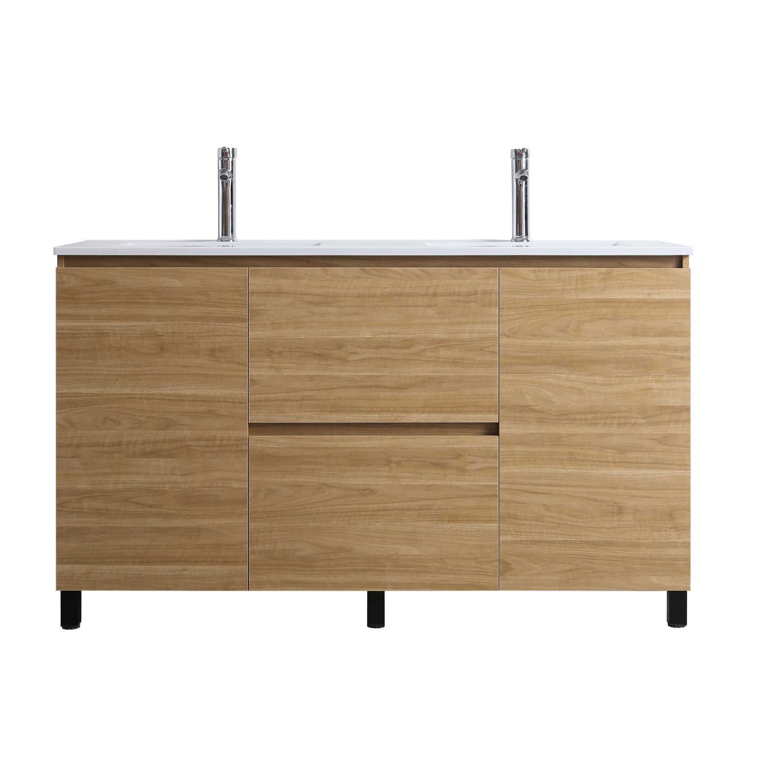 This honey brown coloured vanity has beautiful modern styling that complements any bathroom it is a practical Floor-Standing Design that requires minimal assembly, concealed soft-close door hinges and recessed toe kick. Its doors are 45° oblique, invisible handle and has plenty of storage and counter space; it is also open, easy-access storage spaces.