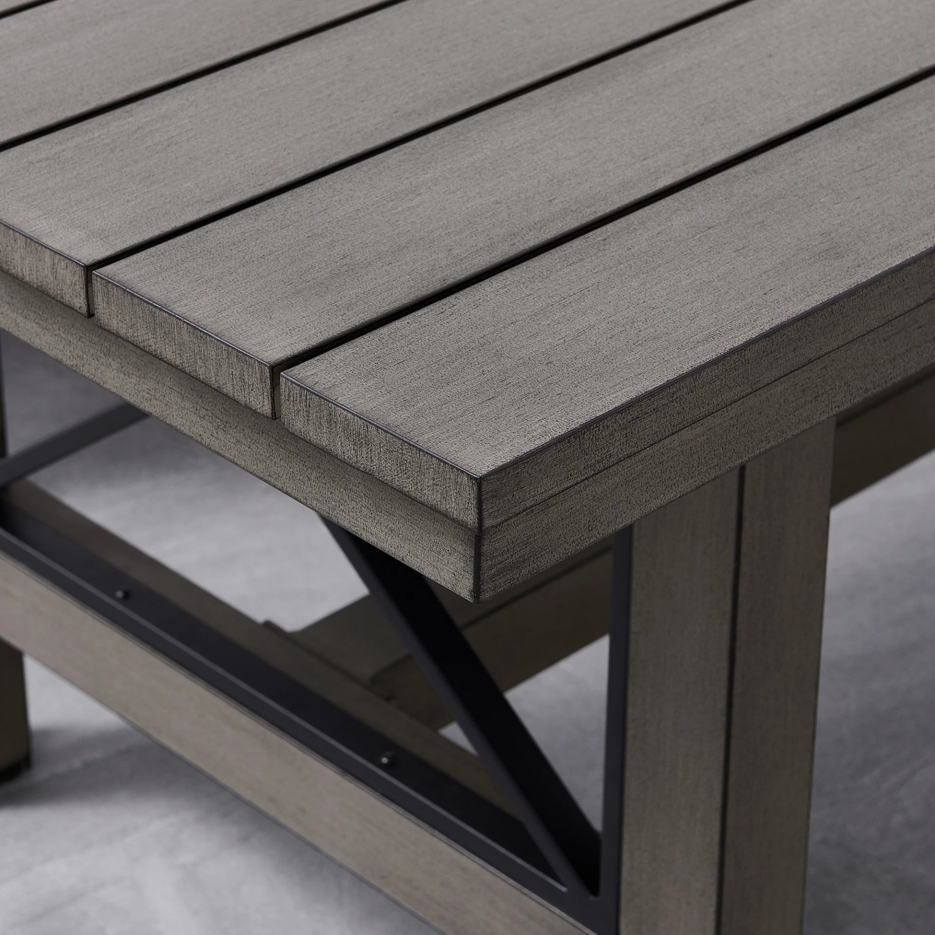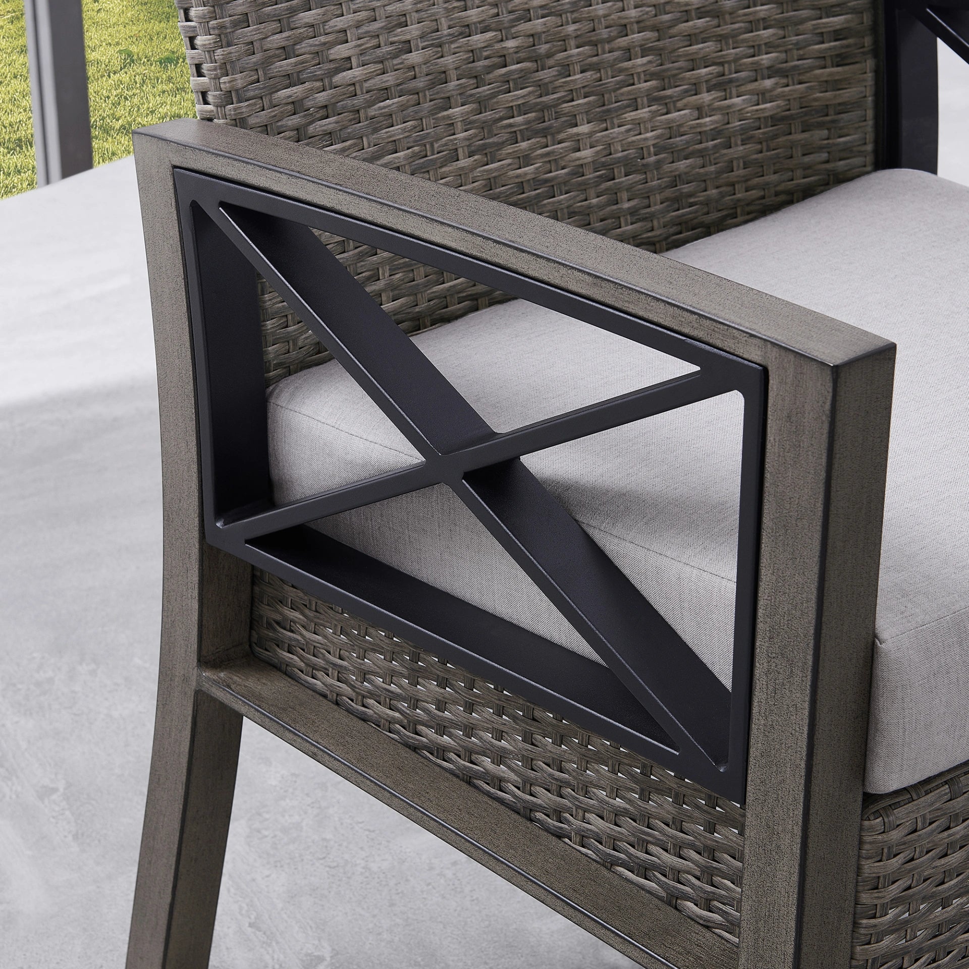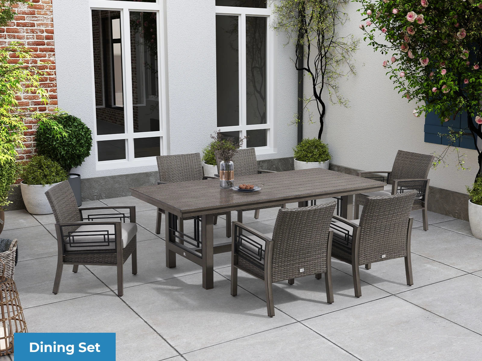 This 7-piece Austin Patio Dining Set by OVE Decors is ready to bring style and utility to your backyard oasis. Complete with a rectangular table and six armrest chairs, this handsome set seats your family or guests comfortably. You’ll simply love that the cushions are made with Sunbrella® fabric that’s resistant to stains, mildew, chlorine and fading. The handsome rustic weathered grey frames, sleek contemporary lines and x-braced arms add an industrial appeal. Add to that its rust-resistant aluminum and all-weather woven resin wicker construction, plus an easy-to-use furniture cover for when not in use, and you’ve got a durable set that’ll stand up to wear and tear for years.