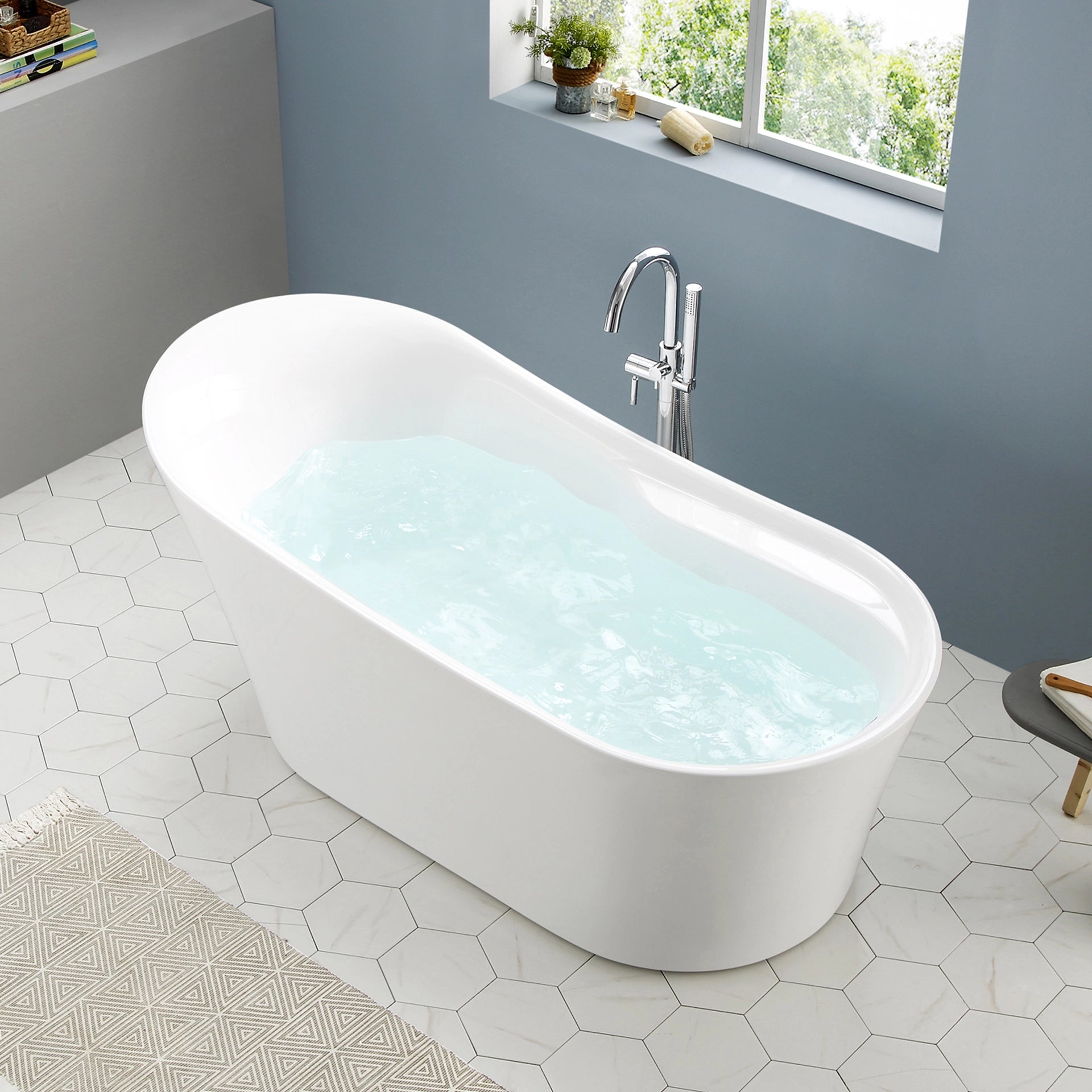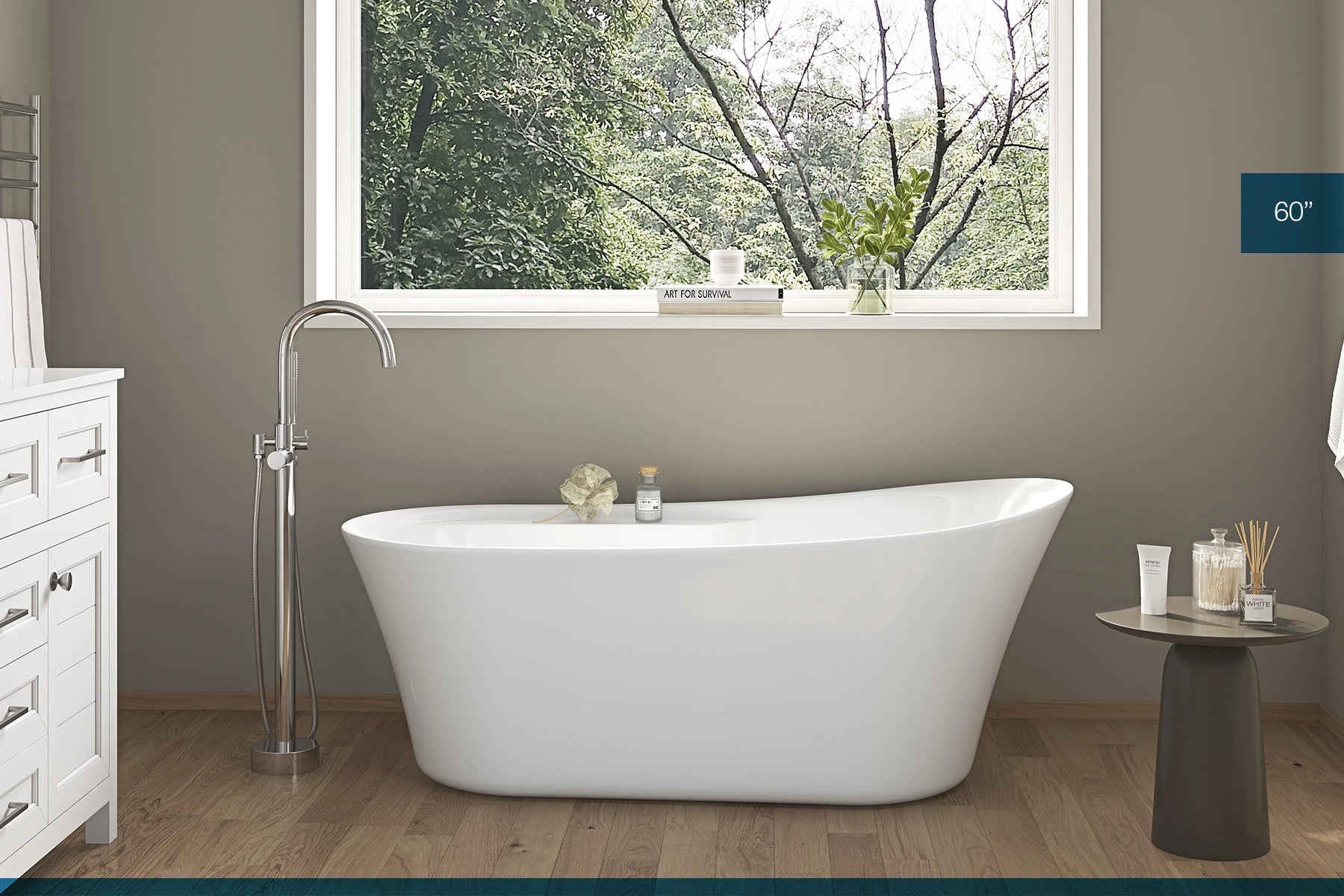 Designed with comfort in mind, the Ava freestanding tub will deliver a spa-like experience to your bathroom. Featuring a sloped backrest and a generous soaking depth, it’s perfectly sized for sharing or stretching out alone. A sleek white acrylic finish with fiberglass reinforcement helps keep your tub scratch-free and looking great for years to come. It includes a high-quality pop-up drain and overflow drain in shiny chrome; simply add your preferred floor mount faucet to complete the look of this elegant and refined tub. Available in 60-inch or 70-inch, choose the size that best suits your space and get ready to say welcome home to your bathroom’s new focal point.