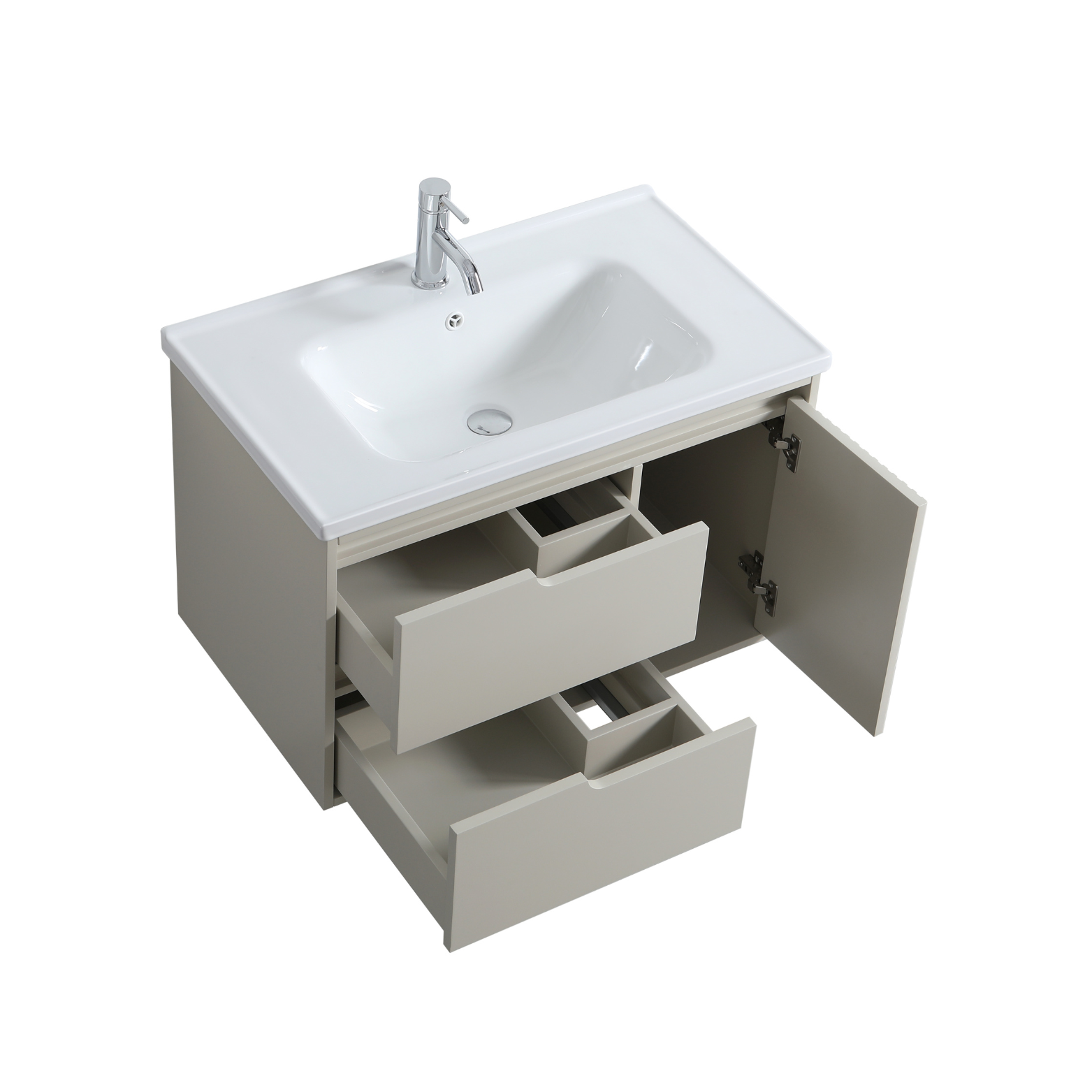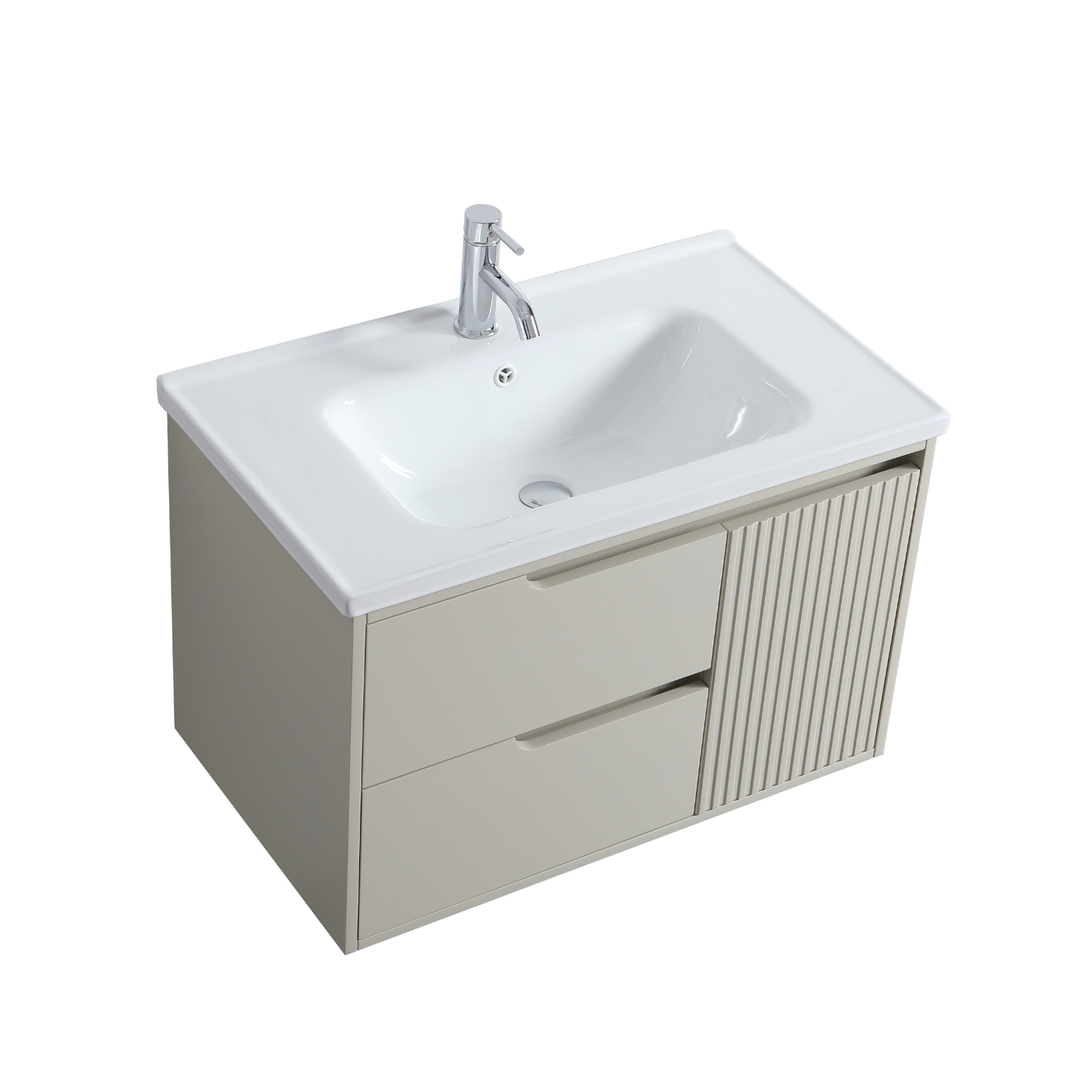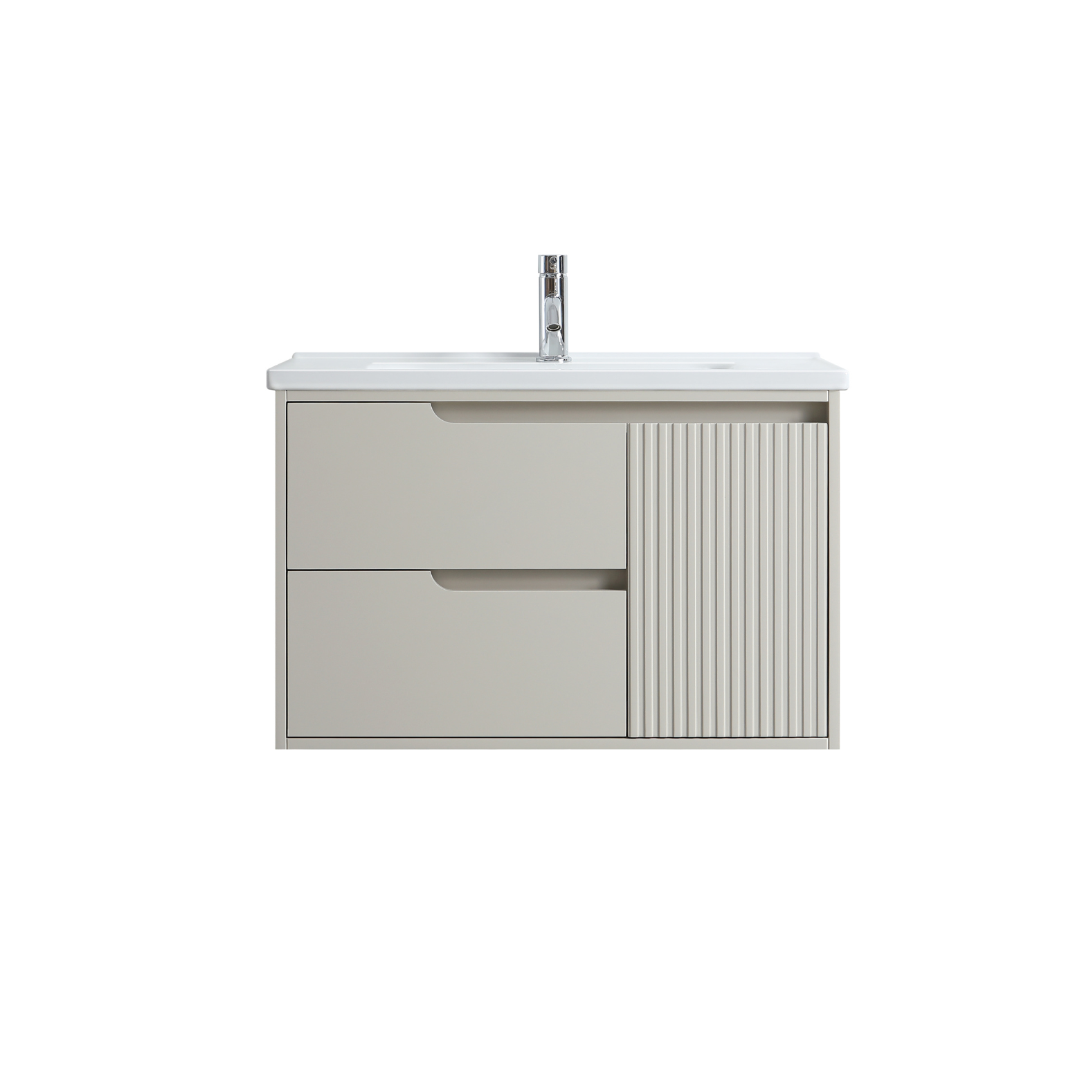 Wall mount 30 inch greige colour vanity with single built-in ceramic countertop.