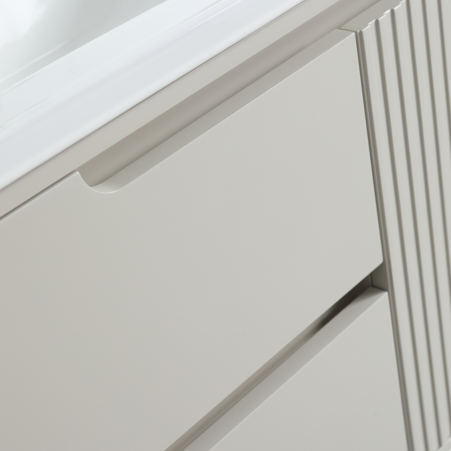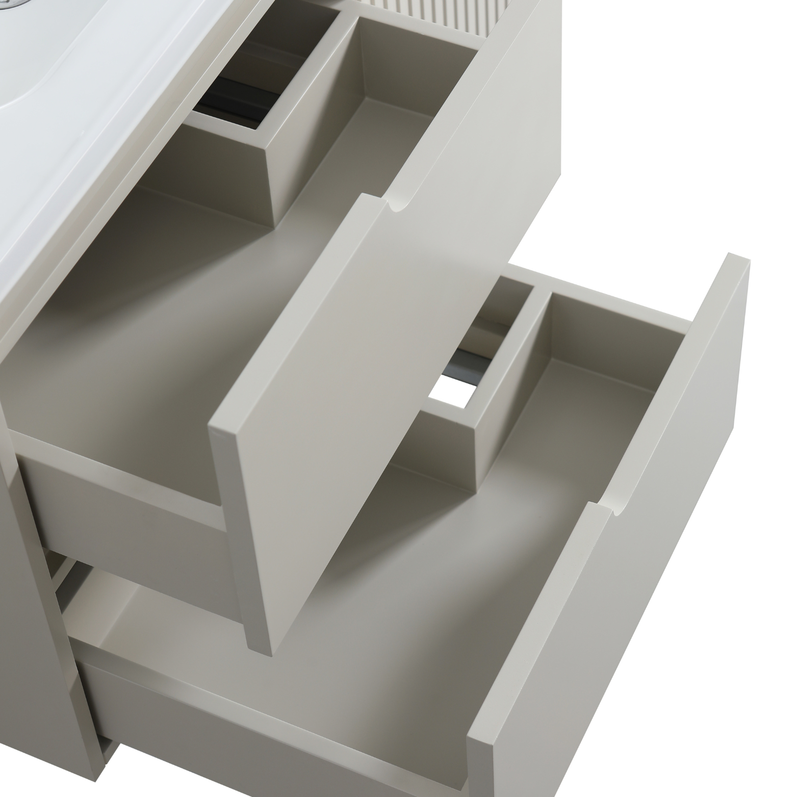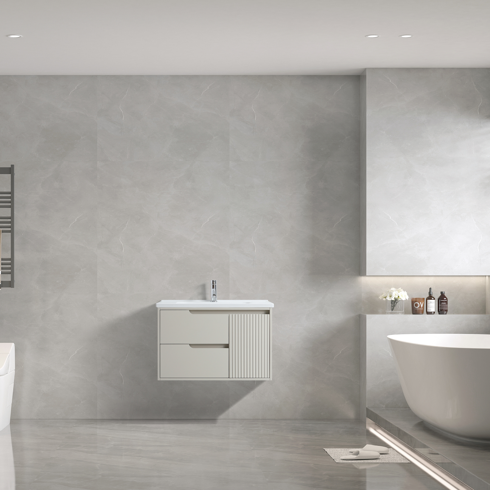 Wall mount 30 inch greige colour vanity with single built-in ceramic countertop.