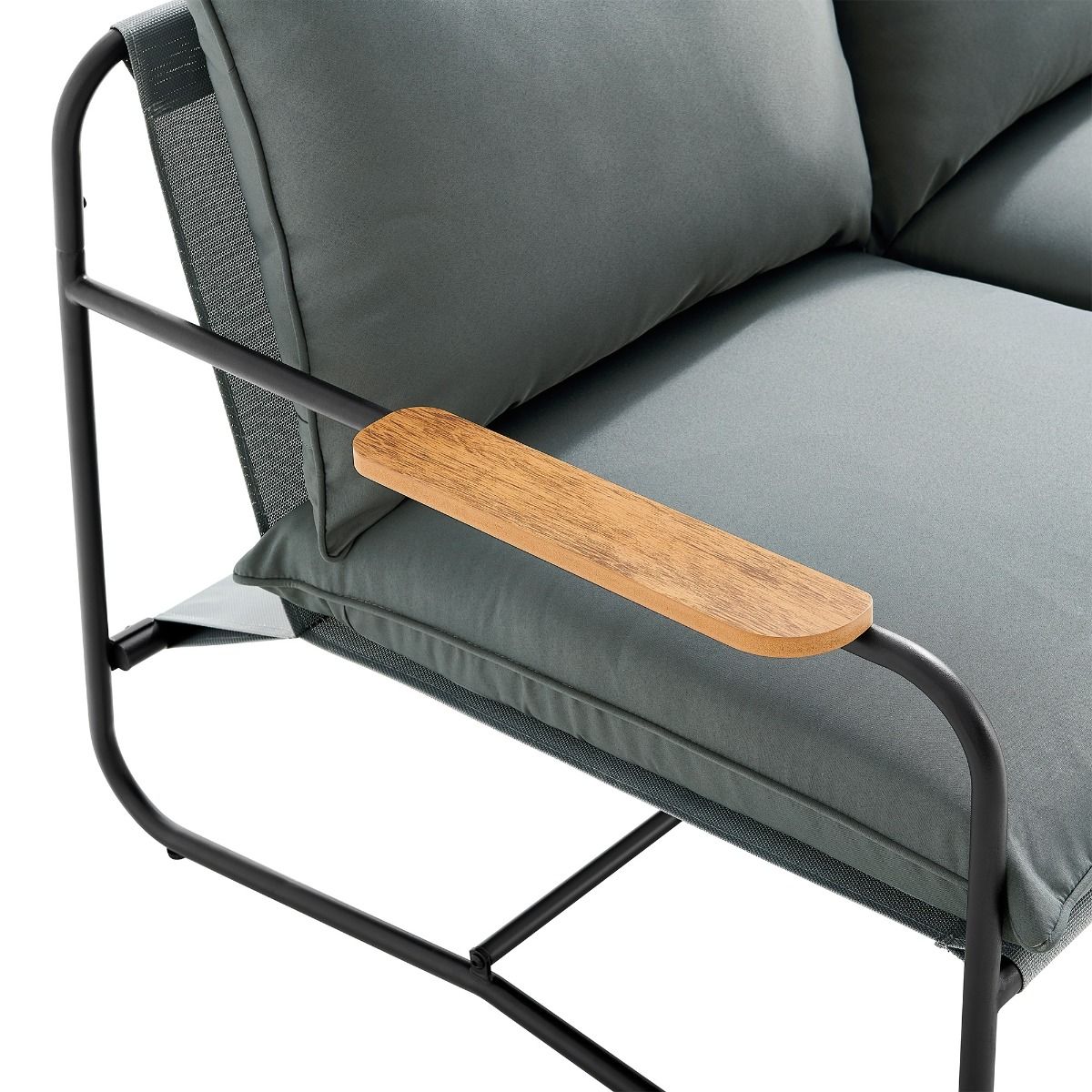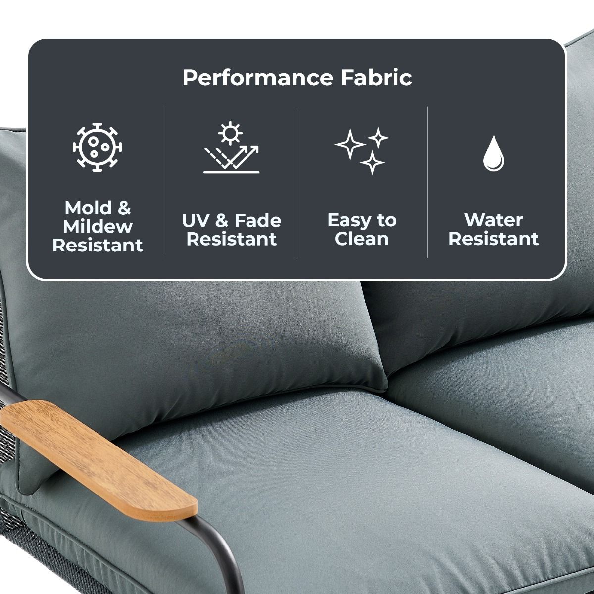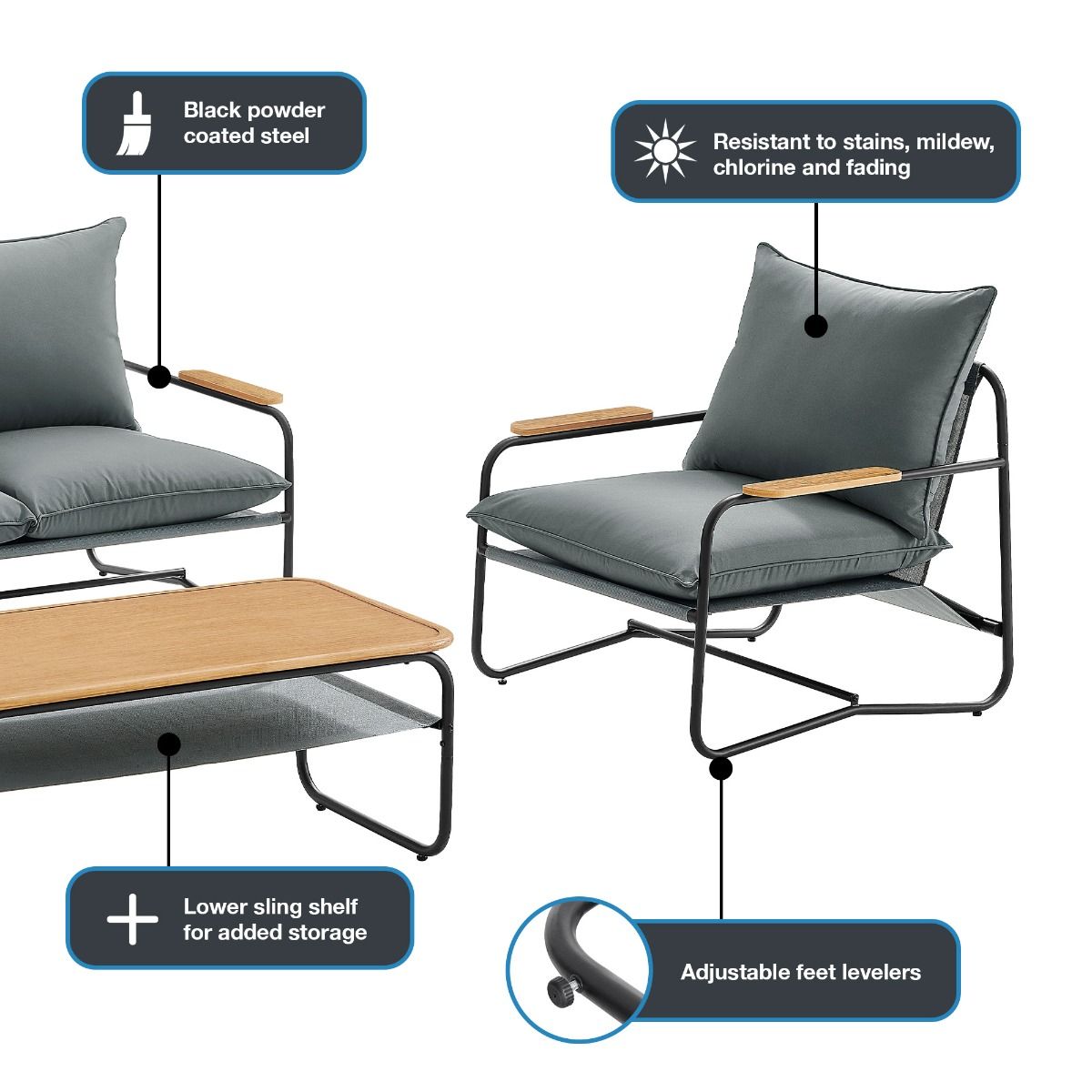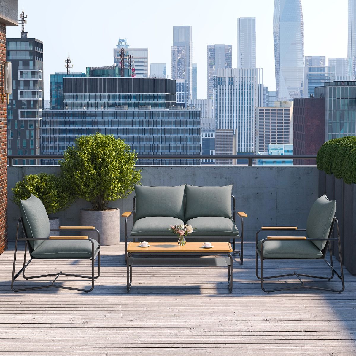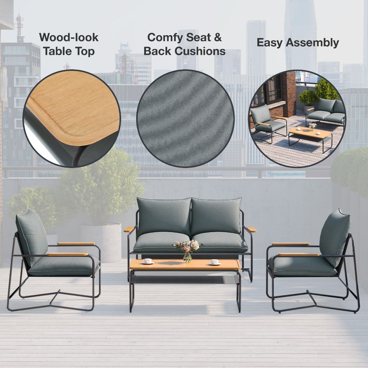 Whether for a city condo or a home in the suburbs, the Barron 4-piece outdoor conversation patio set by OVE Decors will deliver sophisticated style and comfort to your space. Handsome grey cushions join forces with black-painted steel framing and wood-look accents for a statement that is as bold as it is welcoming. High-quality materials and premium construction ensure you'll enjoy this love seat, 2 chairs and coffee table set for the long haul.