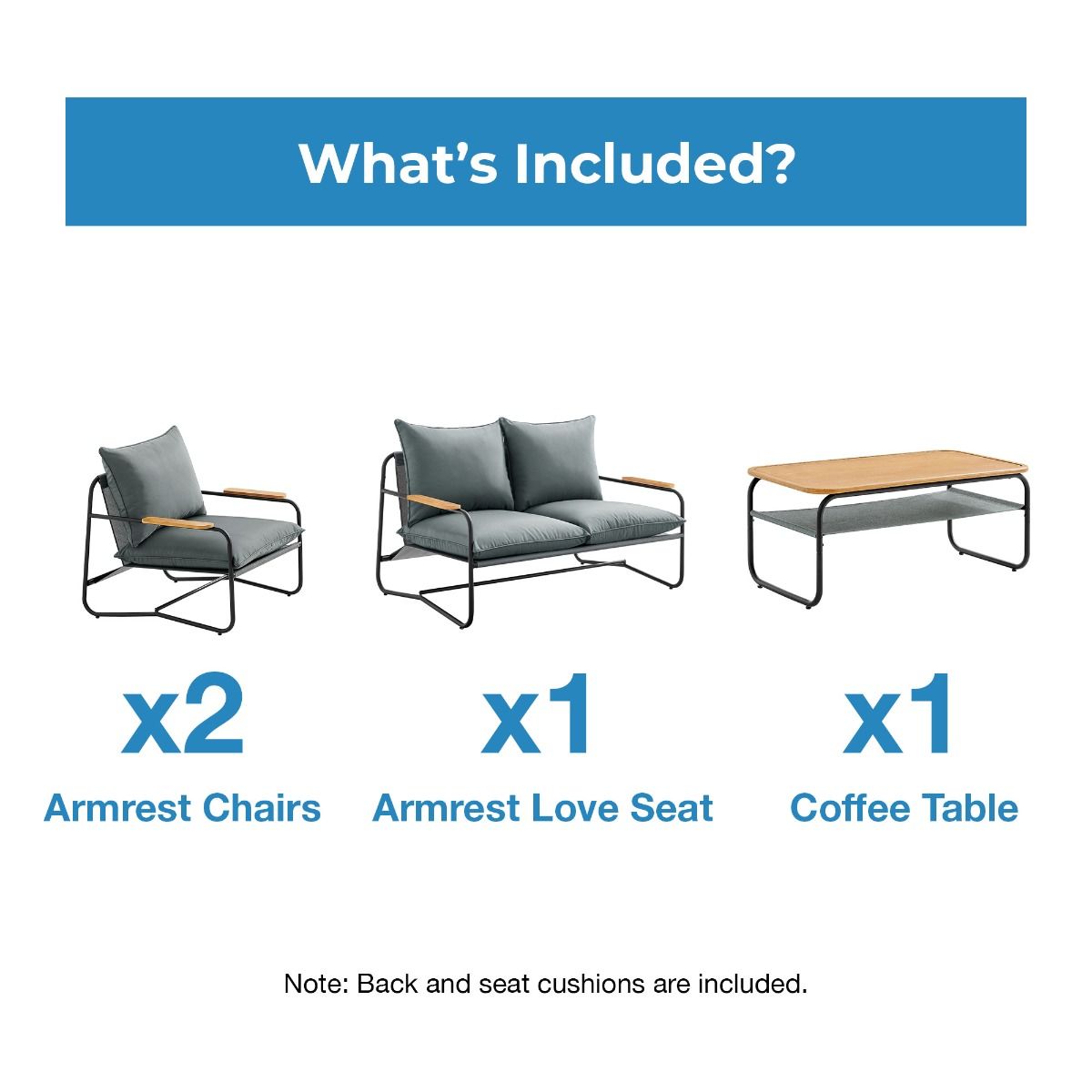 - Includes 2 armrest chairs and 1 loveseat with seat and back cushions, plus a coffee table featuring a stylish wood-look table top.