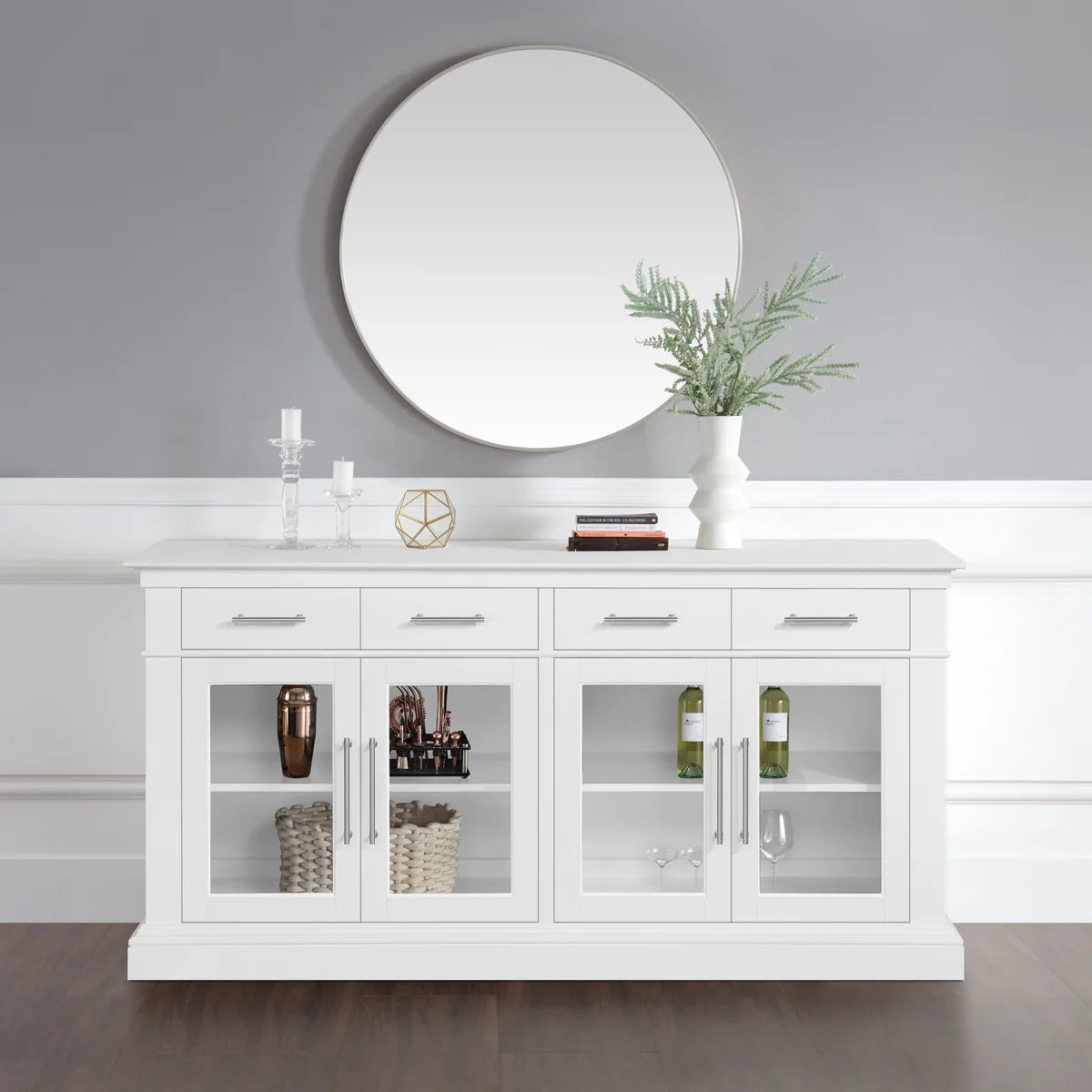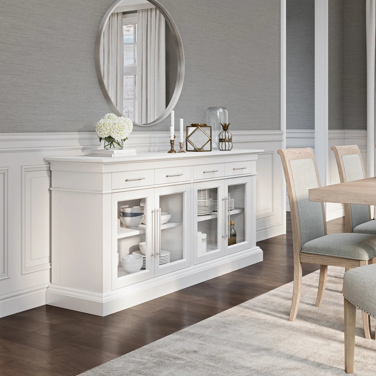Space abounds with the Boston 72” Customizable Accent Cabinet with Storage, with four pull-out, soft-closing drawers and two 2 door cabinets, each equipped with an adjustable interior shelf. The cabinet doors feature interchangeable panels for a personalized look, with glass panels to show off its interior, or wooden panels if you prefer to keep your belongings hidden.