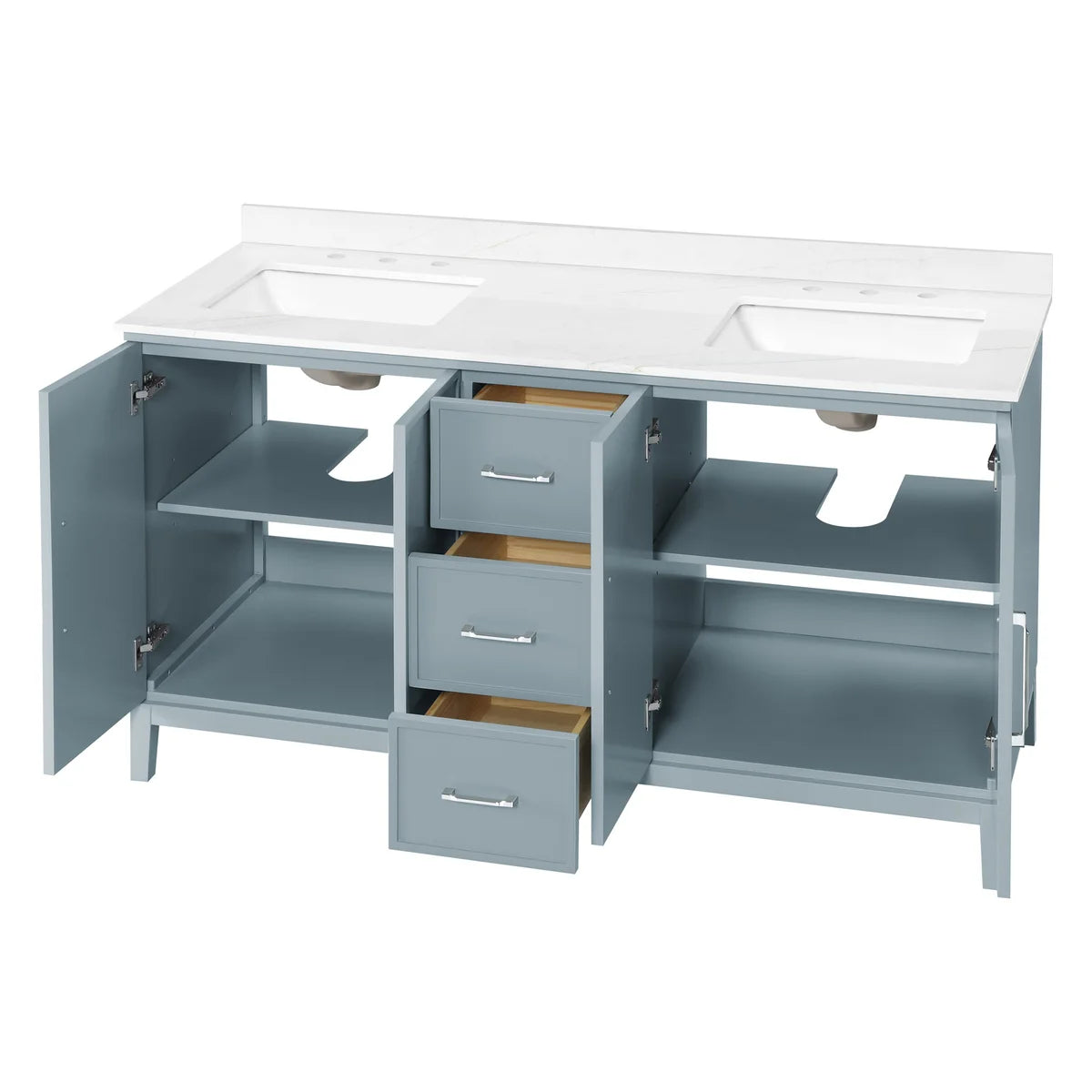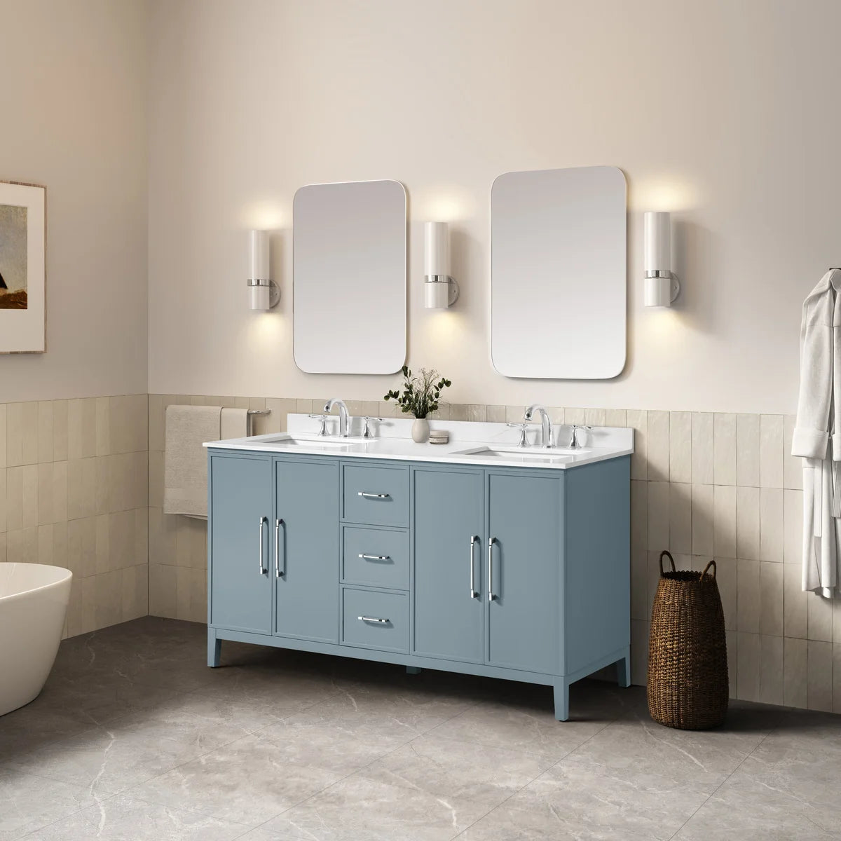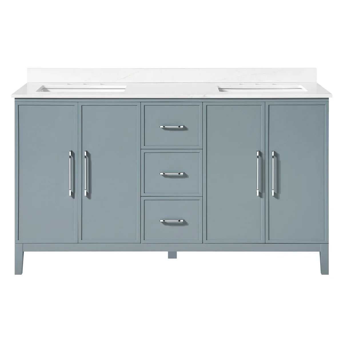Embrace a minimalist aesthetic without sacrificing function with the Codey vanity by OVE. Featuring slim shaker cabinetry and an on-trend yet timeless Water Edge Blue finish, it would make an ideal addition to any modern bathroom. Chrome drawer pulls and 8.3-inch-long door handles punctuate this piece with bold style, while its luxurious Calacatta quartz countertop with undermount rectangular sink(s) and matching 3-inch backsplash maintain a light and airy feel. You’ll love its mix of drawers, doors, and adjustable interior shelving that discreetly stash away all your essentials for a clean and organized look.