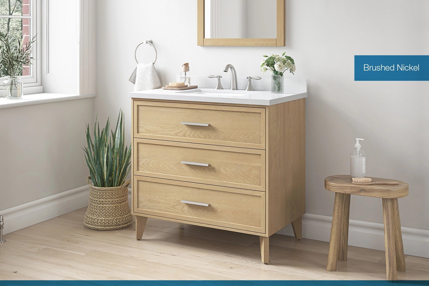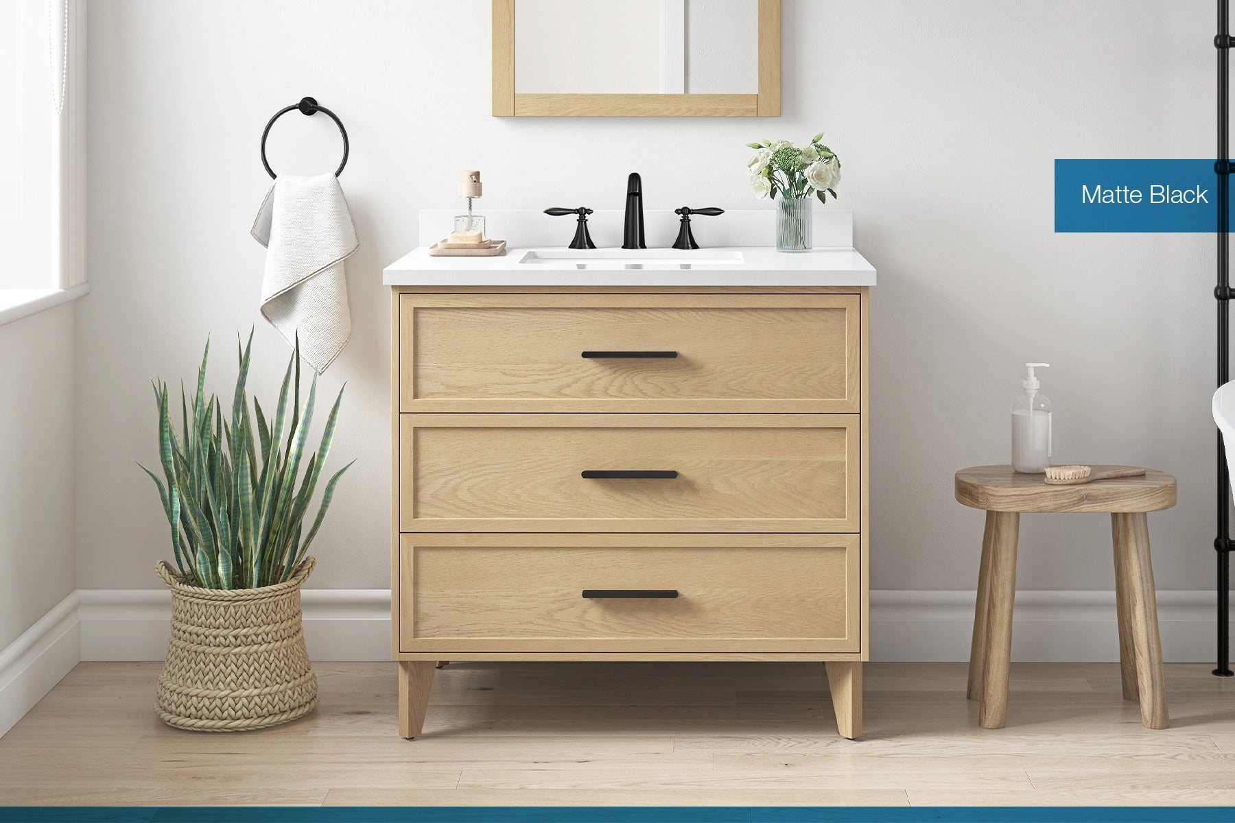 Featuring a stylish finish and a modern slim shaker design, the Colin bathroom vanity by OVE Decors is set to bring a fresh new look to your powder room or small bathroom. Designed with plenty of storage in mind, its three drawers keep everything within reach yet tucked out of sight. There’s even an interior tray in the top drawer for organizing small items like contact lenses, accessories, makeup and more. Topping off the beautiful cabinet is a sleek White quartz countertop and your choice of two sets of included hardware in Matte Black and Brushed Nickel.