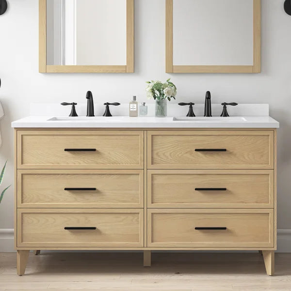 Featuring a stylish finish and a modern slim shaker design, the Colin bathroom vanity by OVE Decors is set to bring a fresh new look to your main bathroom or master ensuite. Designed with plenty of storage in mind, its six drawers keep everything within reach yet tucked out of sight. It even comes with two interior trays in the top drawers for organizing small items like contact lenses, accessories, makeup and more. Topping off the beautiful cabinet is a sleek White quartz countertop with two undermount sinks and your choice of two sets of included hardware in Matte Black and Brushed Nickel.