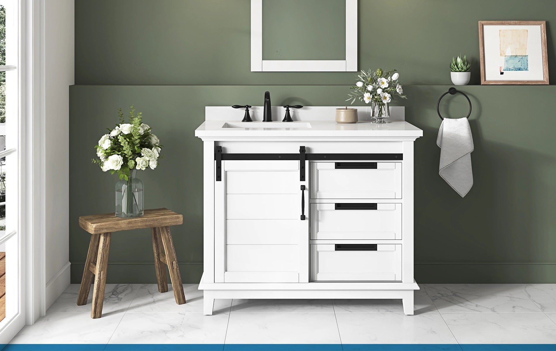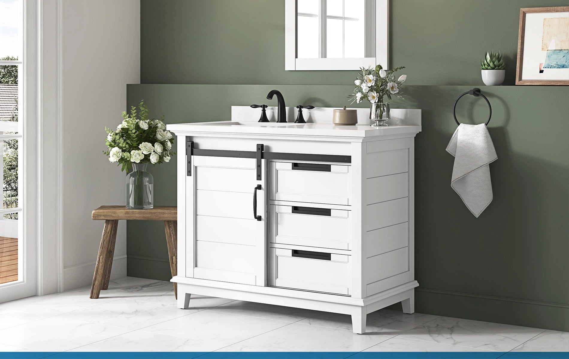 Brighten up your bathroom with the traditional-inspired Ernest bathroom vanity, with integrated off-centre sink and premium wooden cabinet. An ideal decor option for those longing for the textures and colours of traditional designs, this piece comes with a rustic-style sliding cabinet door, as well as three spacious drawers with built-in dividers. Furthermore, its soft-close technology and durable, easy-to-maintain finishes on the cabinet and countertop ensure total peace of mind. The Ernest vanity comes pre-assembled and ready for installation, and is available in widths of 42-in and 60-in.