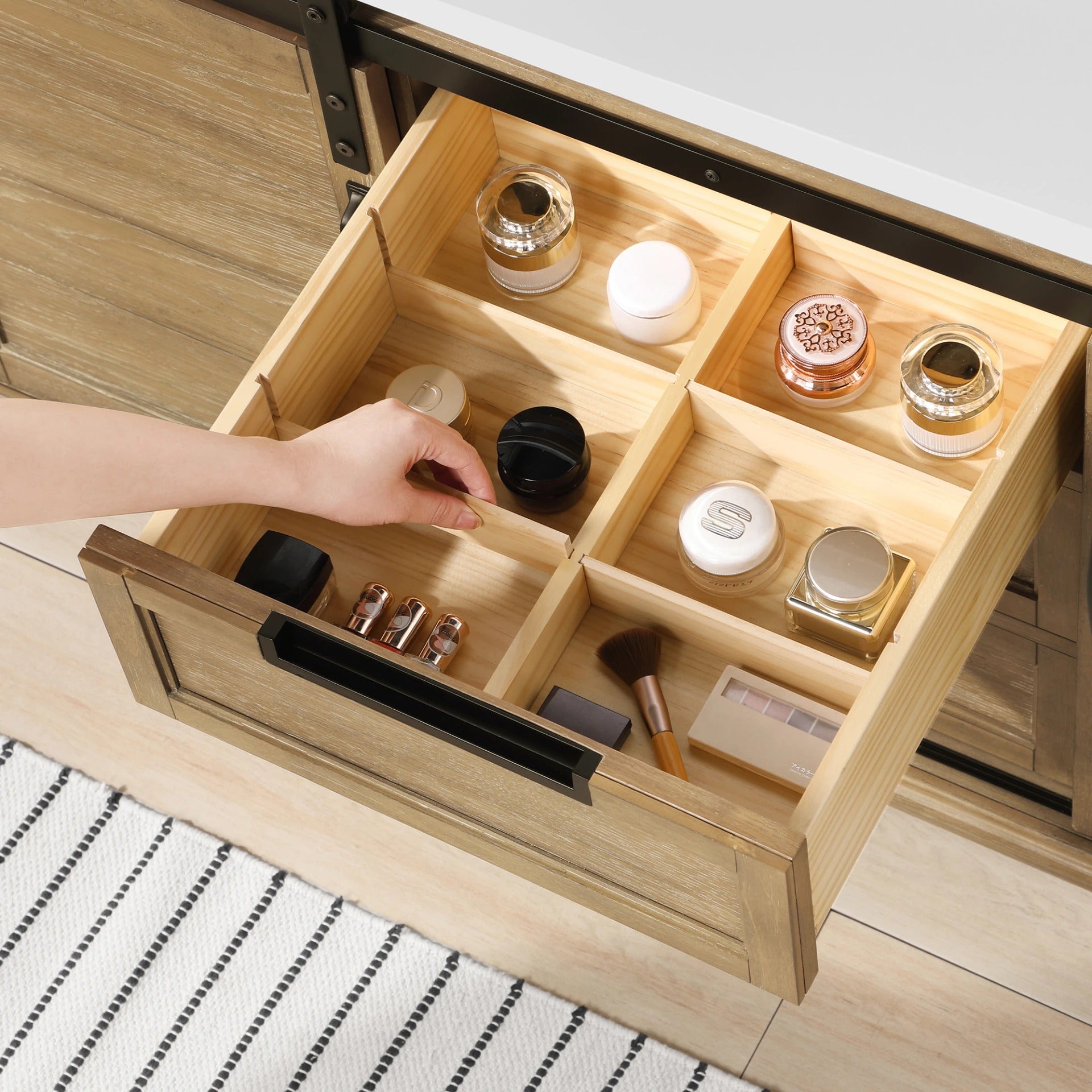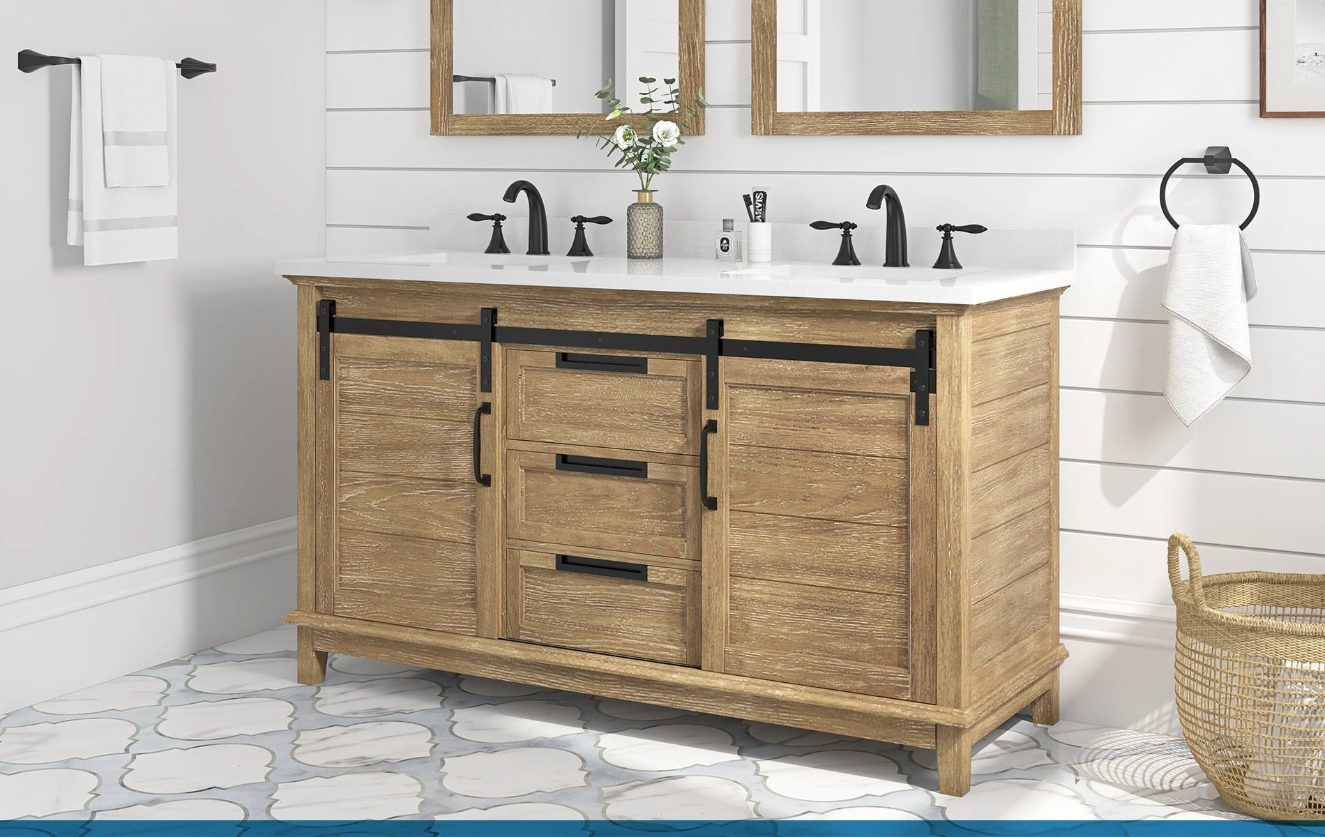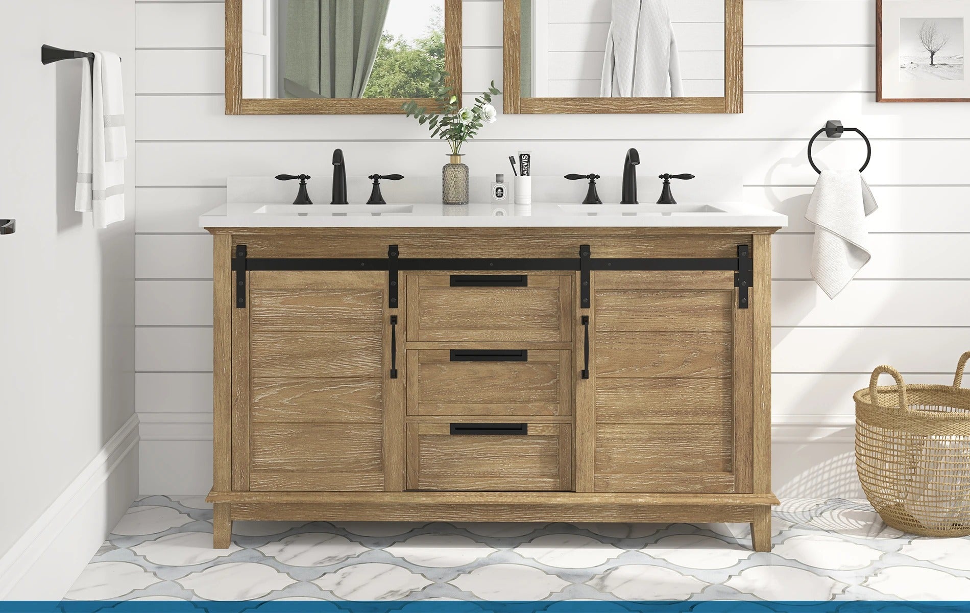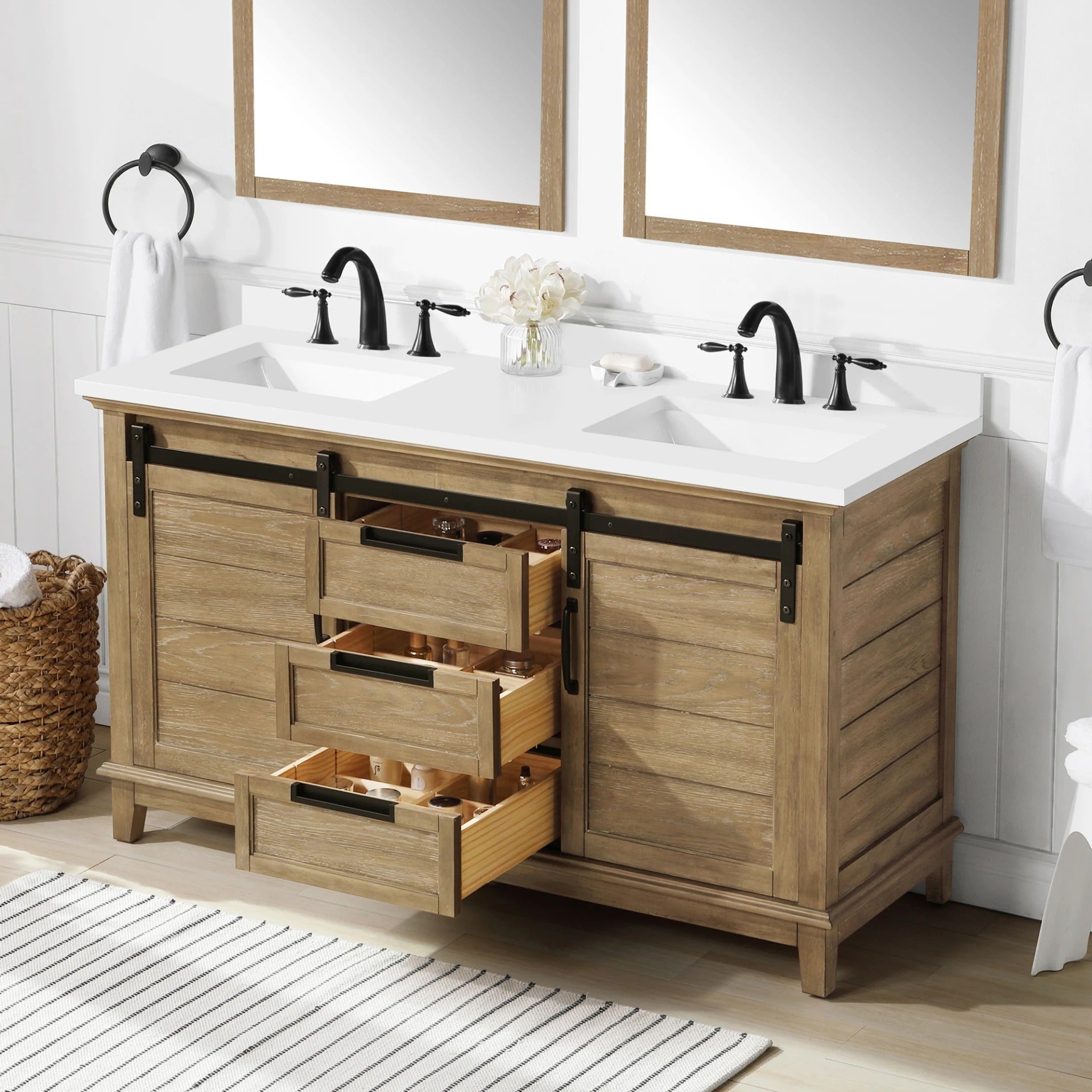 Brighten up your bathroom with the traditional-inspired Ernest bathroom vanity, with dual integrated sinks and premium wooden cabinet. An ideal decor option for those longing for the textures and colours of traditional designs, this piece comes with two rustic-style sliding cabinet doors, as well as three drawers in the centre, each with built-in dividers. Furthermore, its soft-close technology and durable, easy-to-maintain finishes on the cabinet and countertop ensure total peace of mind. The Ernest vanity comes pre-assembled and ready for installation, and is available in widths of 42-in and 60-in.