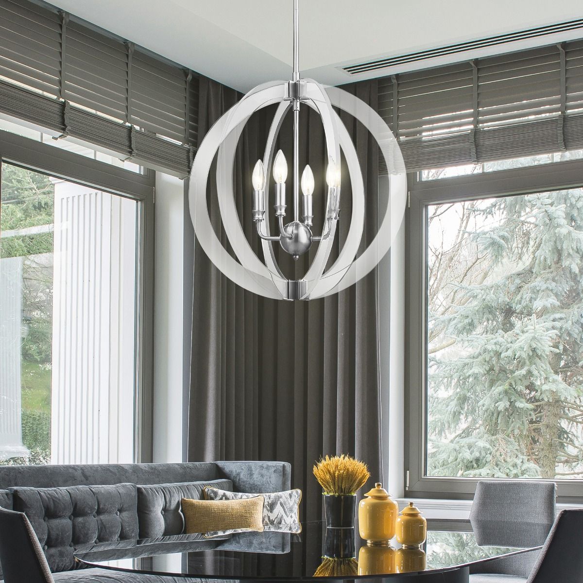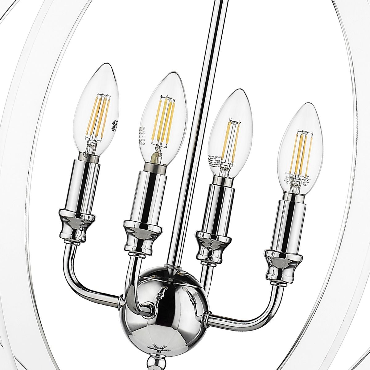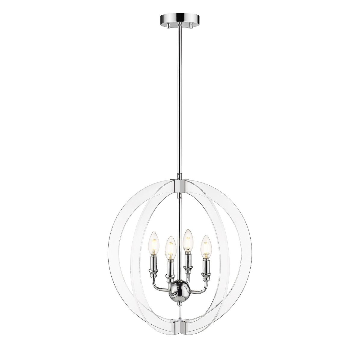 Dreamy transparency stars in the Isabelle 4-light globe chandelier by OVE Decors. Striking interlocking rings of clear acrylic surround the central four arm chandelier in gleaming polished chrome for a glamorous statement piece for your decor. Dimmable soft white LED bulbs create inviting dinner party ambiance, or light up the night in an impressive foyer.