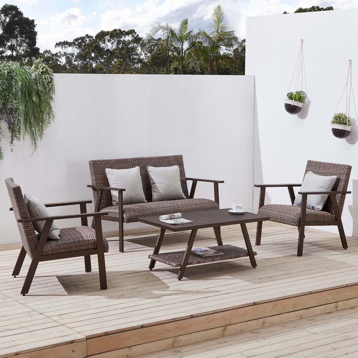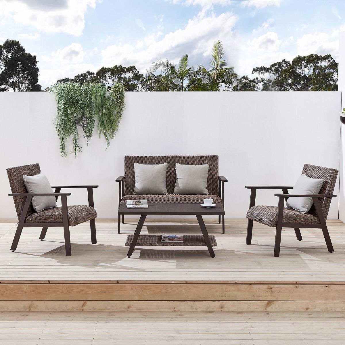 Create a contemporary cool outdoor hangout spot ideal for sipping cocktails or catching up with friends with the Jennings 4-piece patio conversation set by OVE Decors. A love seat, two club chairs and rectangular coffee table with lower wicker shelf share a sleek mid-century silhouette with easy to maintain wood grained brown aluminum frames and tightly woven rattan wicker ready for any weather. Four jaunty accent pillows add a splash of fun, while levelling feet keep everything on the up and up.