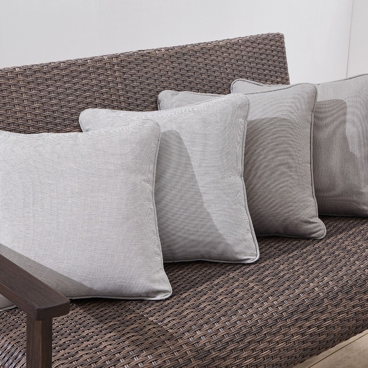 - Sturdy flatwoven brown polyethylene resin wicker seats + backs