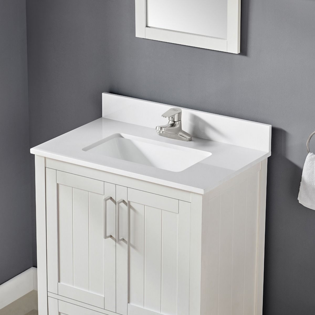 - Includes an 18-mm engineered stone countertop with 3-in matching backsplash