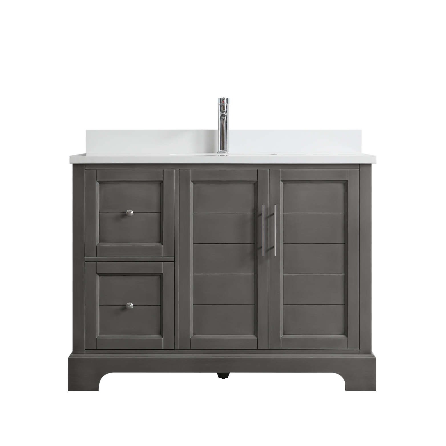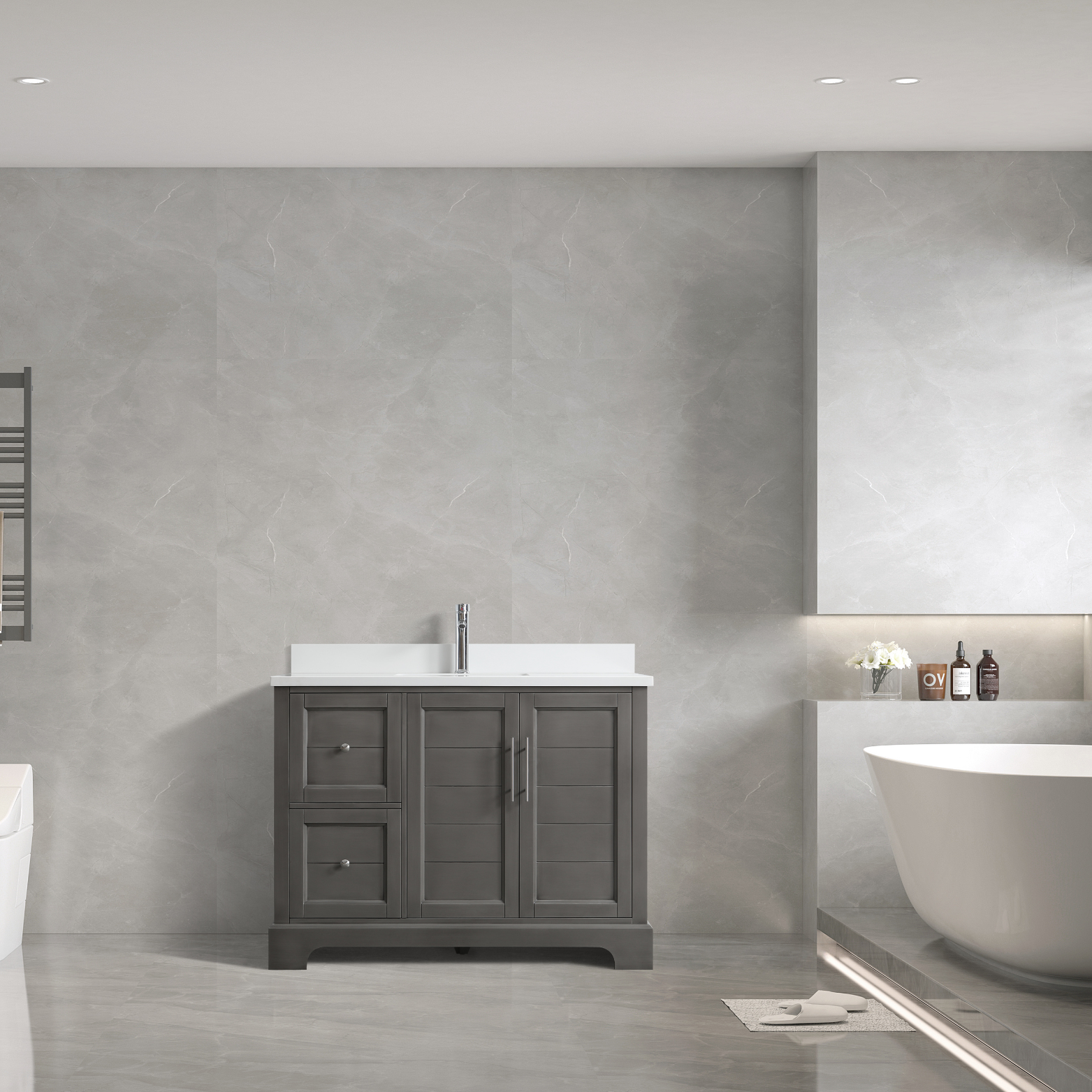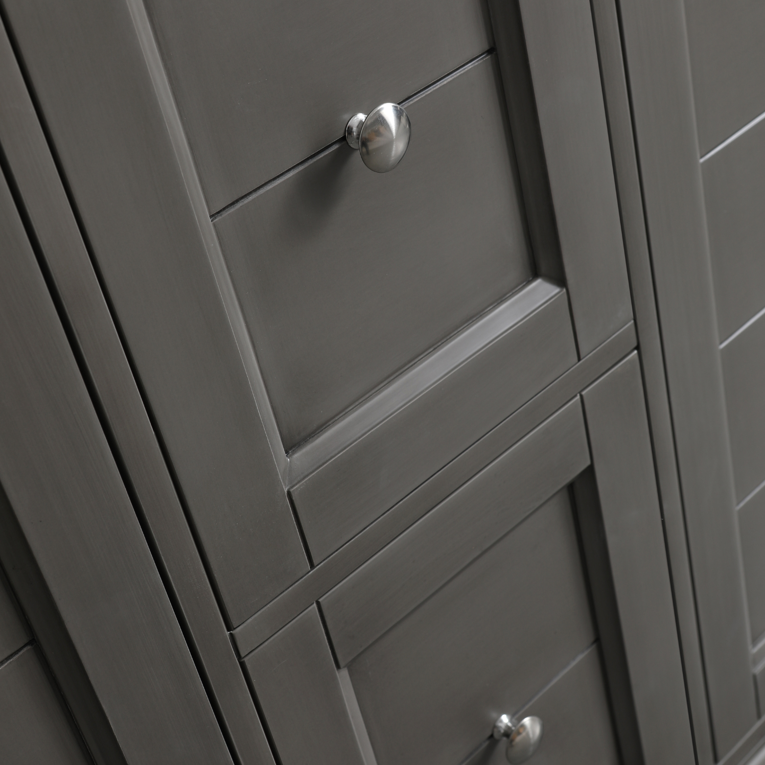 Crafted with a solid wood carcass and MDF featuring a sleek white lacquer finish, this vanity offers durability and style. A 2cm pure white quartz stone countertop, paired with an undermount CUPC-certified ceramic basin, enhances the vanity’s sophistication. The varnished drawers with 16-inch HDE full extension sliders ensure smooth operation, while the 3-point adjustable shelf inside the door sections provides customizable storage. Designed with a single faucet hole, this vanity is perfect for a refined bathroom upgrade.