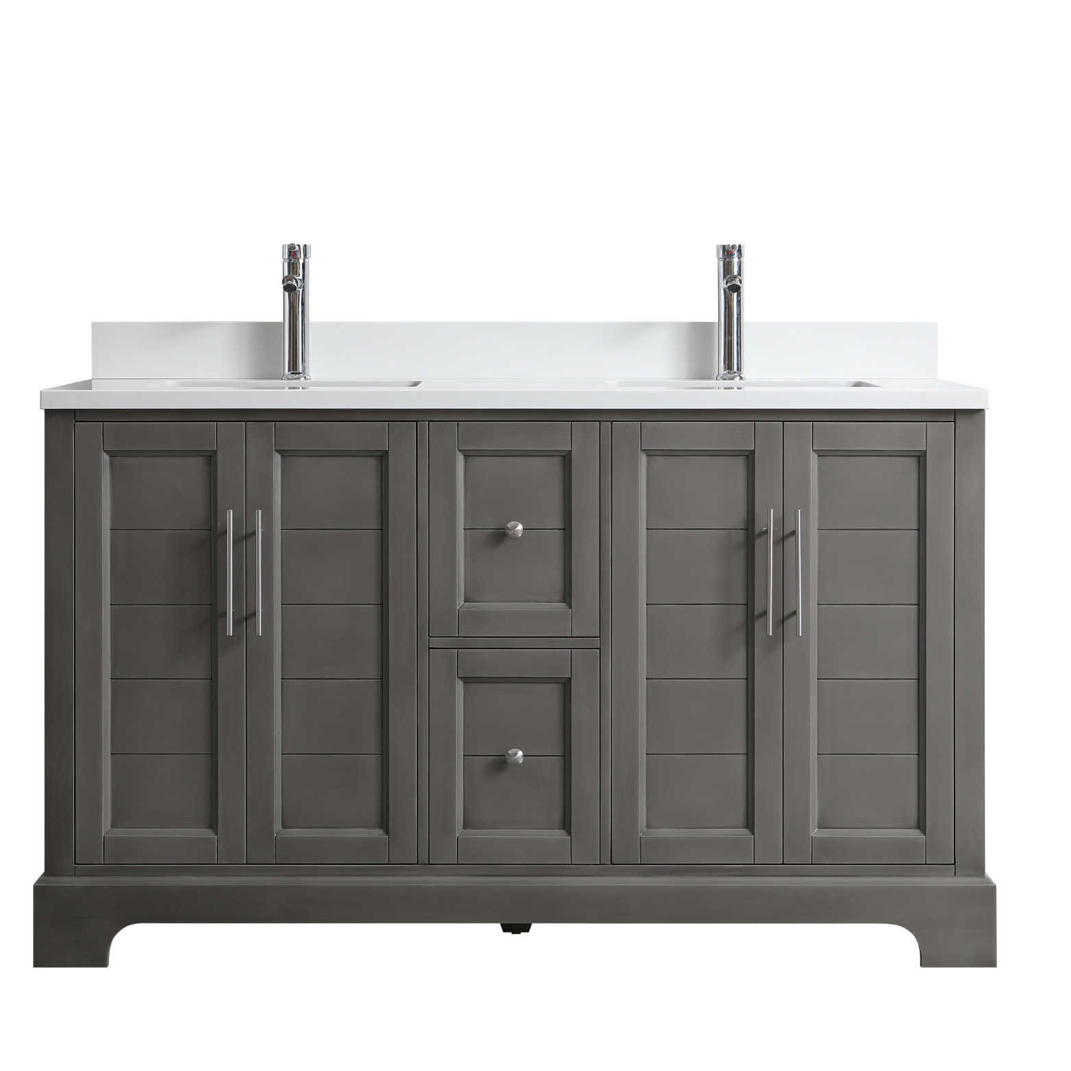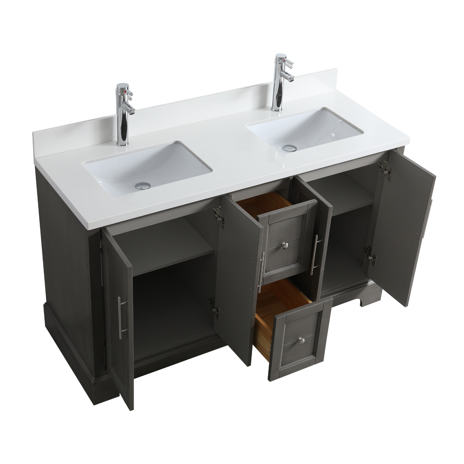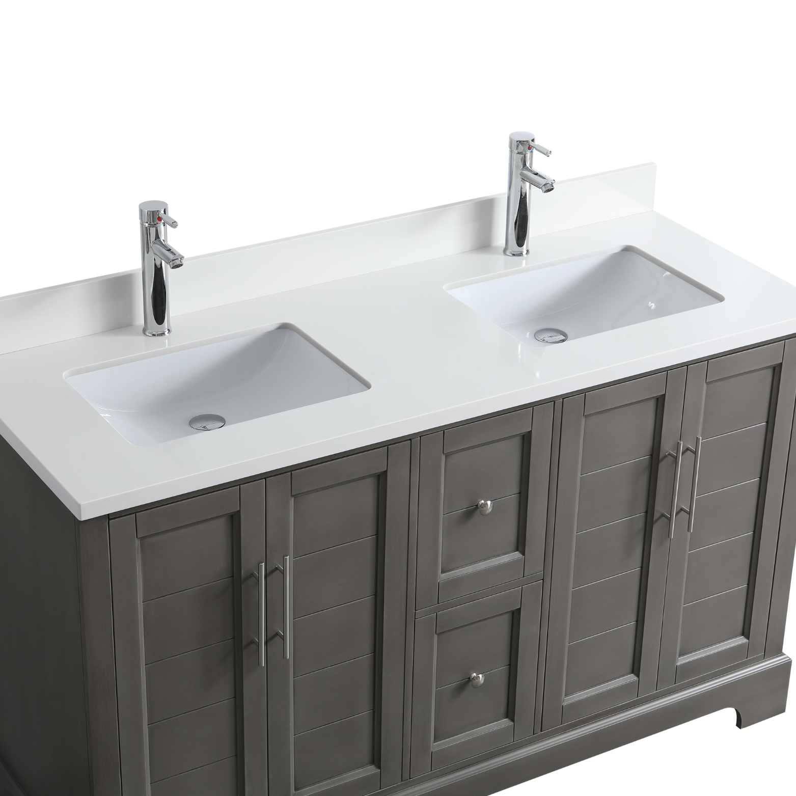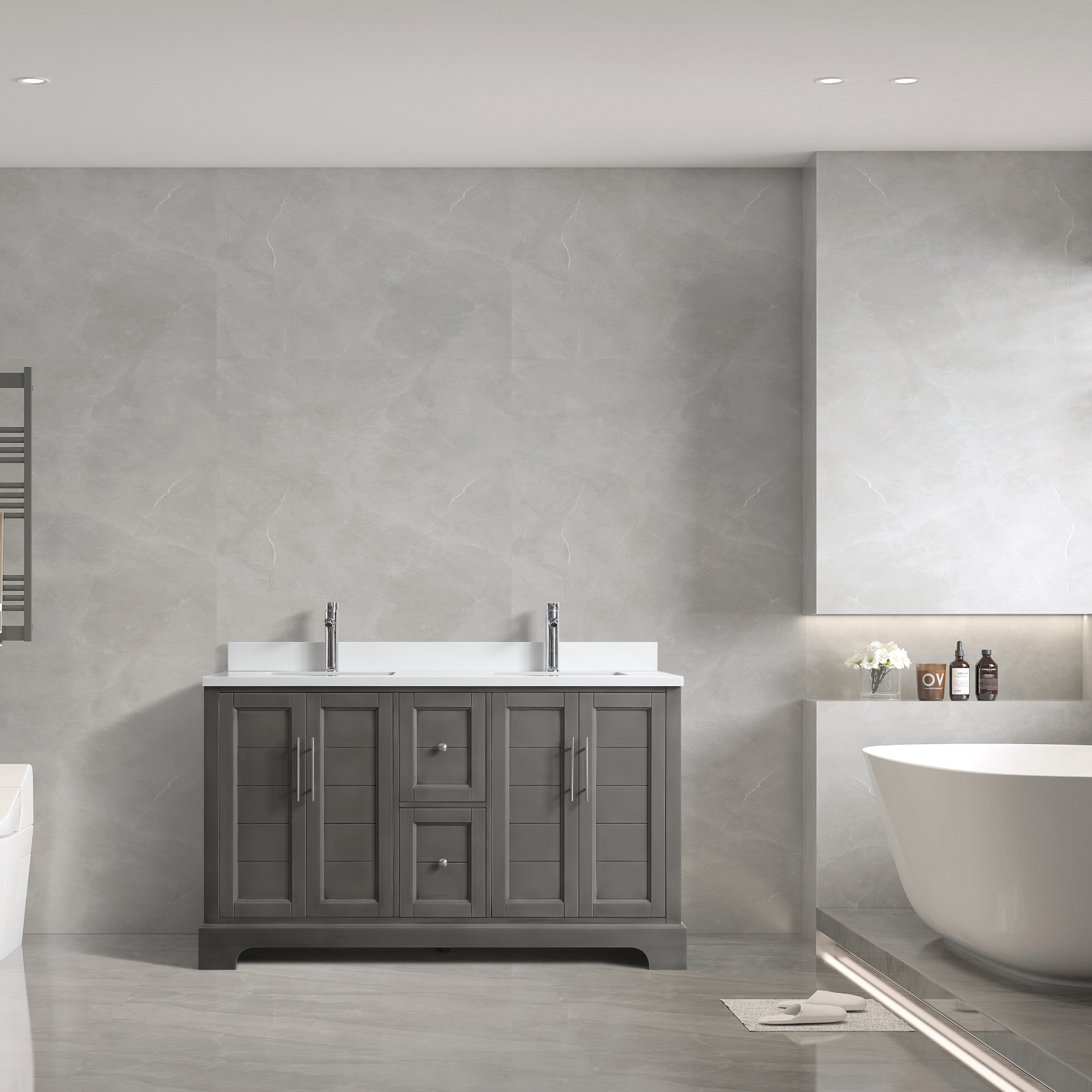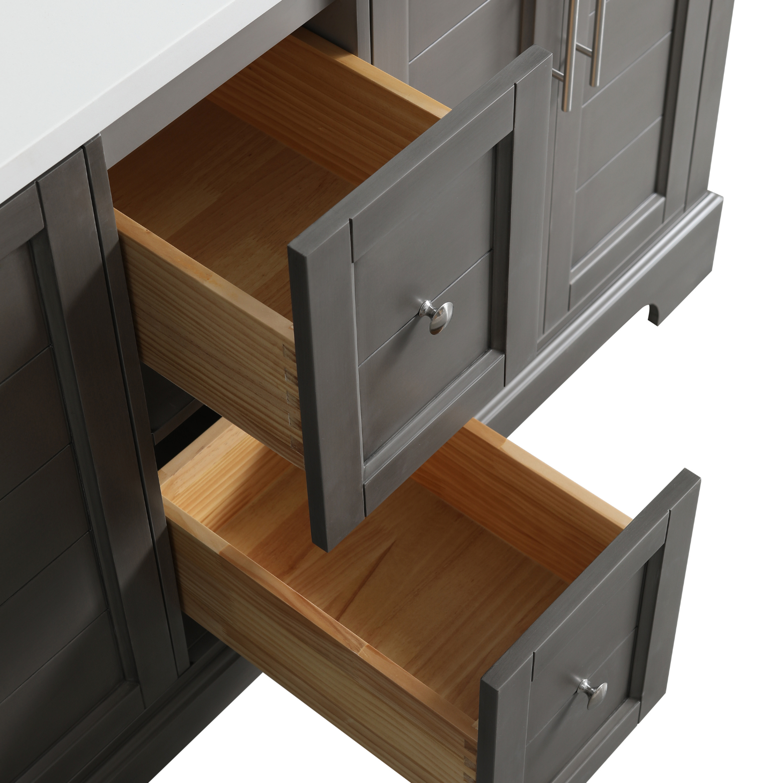 Crafted with a solid wood carcass and MDF featuring a sleek white lacquer finish, this vanity offers durability and style. A 2cm pure white quartz stone countertop, paired with an undermount CUPC-certified ceramic basin, enhances the vanity’s sophistication. The varnished drawers with 16-inch HDE full extension sliders ensure smooth operation, while the 3-point adjustable shelf inside the door sections provides customizable storage. Designed with a single faucet hole, this vanity is perfect for a refined bathroom upgrade.