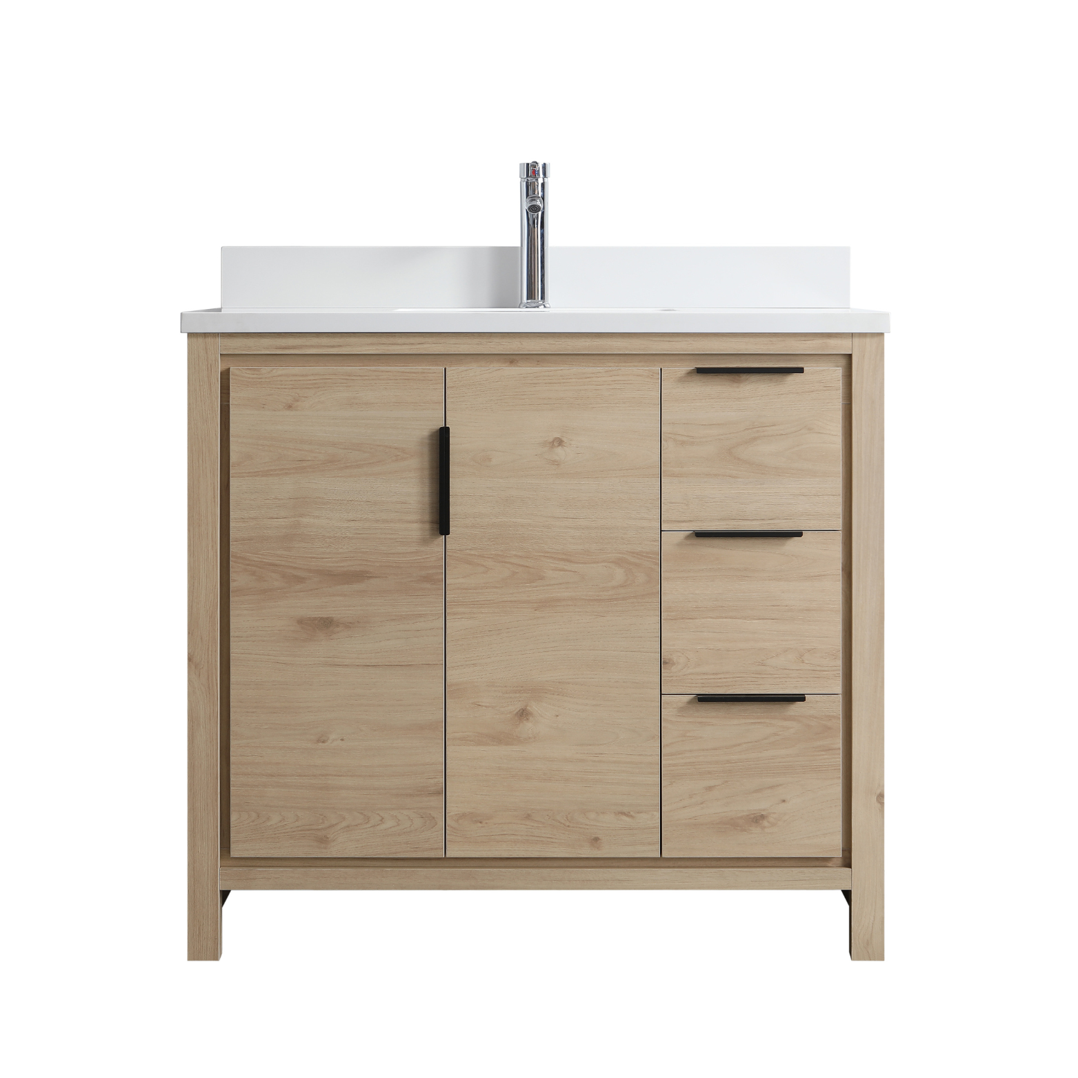 - Contemporary bathroom vanity with a durable melamine veneer finish