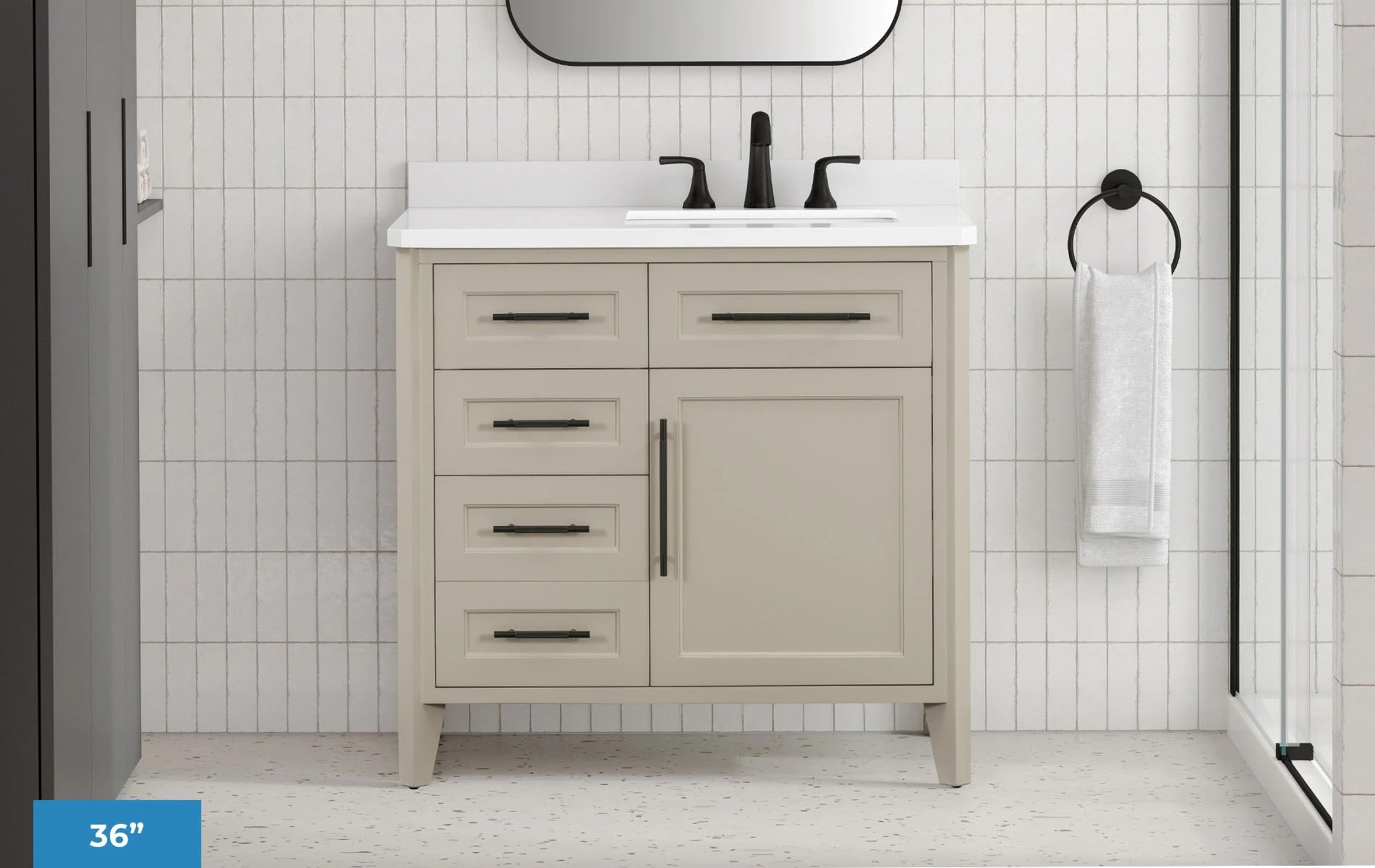 From powder rooms to master bathrooms, get ready to max out on style and storage with the Renfrew. Crafted with a universally appealing transitional design, a calming Greige painted finish and matte black hardware, it will steal the spotlight in your bathroom renovation. You’ll find a smartly appointed configuration of drawers, cabinets and adjustable shelving to optimize your space and keep your essentials organized. Finishing off the look is a premium white quartz countertop, matching 3-inch high backsplash and easy-to-clean undermount rectangular sink(s). Available in 36 in., 42 in., 60 in., and 72 in. widths, your gorgeous new vanity is waiting for you.