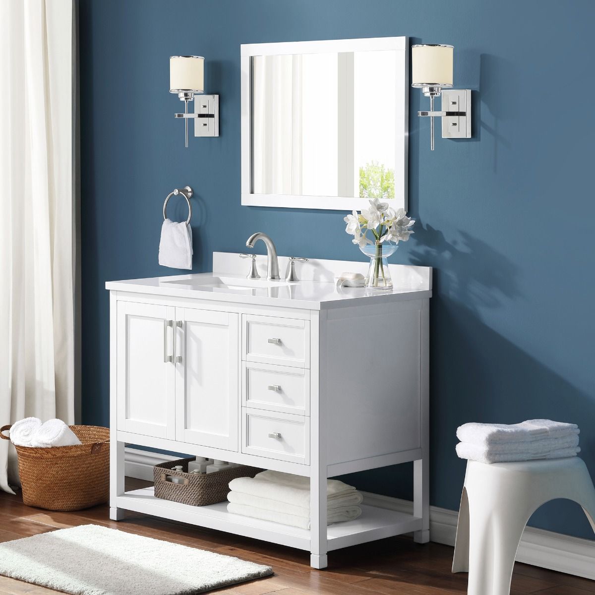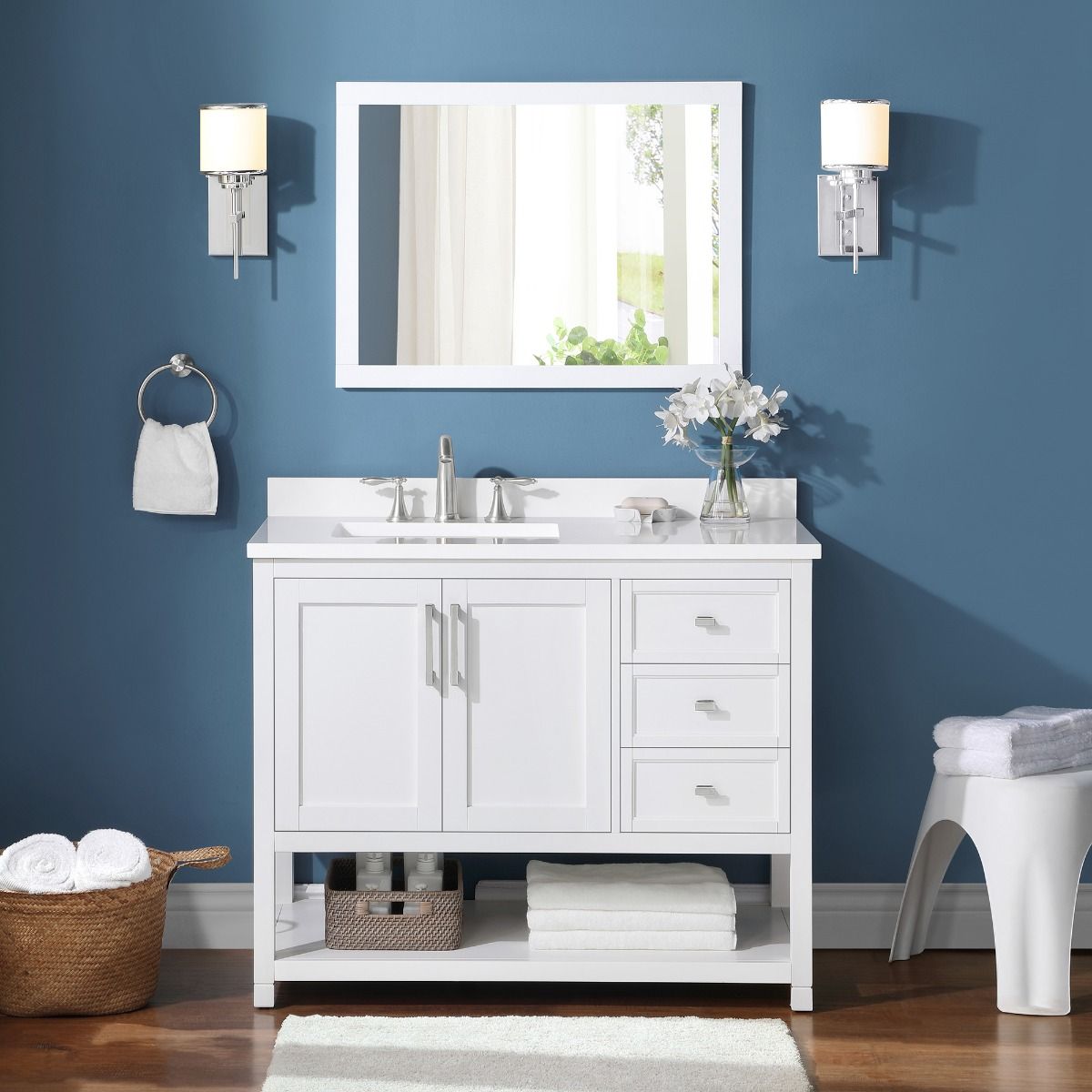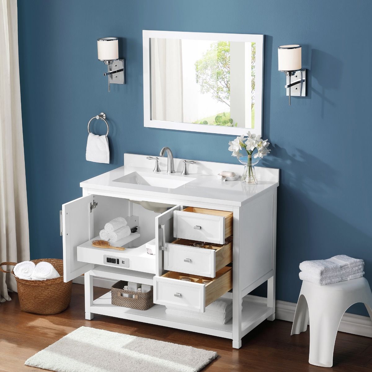 Streamline those rushed mornings with the modern conveniences and stunning contemporary aesthetics of the Stanley 42-inch wide left offset vanity. Its chic pure white lacquered finish with handsome brushed nickel hardware is topped by a slab of ultra white engineered stone with a matching 3-inch high backsplash and undermount rectangular sink. Below you’ll find a double door cabinet complete with a pull-out shelf holding a handy built-in power strip with sockets and USB ports plus smart hair styling tool holders with heat protective cladding. Three flanking dovetailed soft-close drawers include extra storage boxes to tidy away small items, while a farmhouse chic open bottom shelf is ideal for displaying pretty stacks of towels or baskets.