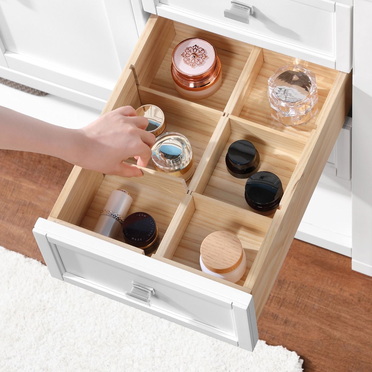 - 3 dovetailed drawers with 2 extra storage boxes included in top drawer