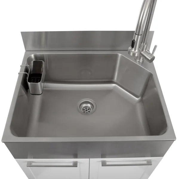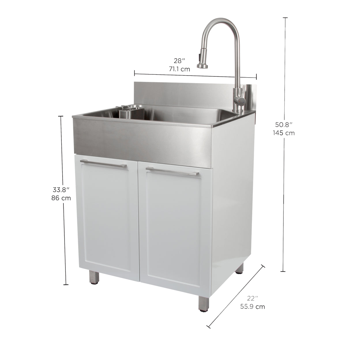 - Dimensions with faucet: (L × W × H) : 71.1 cm × 55.9 cm × 130.81 cm (28 in. × 22 in. × 51.5 in.) Dimensions without faucet (L × W × H) : 71.1 cm × 55.9 cm × 86 cm (28 in. × 22 in. × 33.8 in.) Dimensions with backsplash, without faucet (L × W × H) : 71.1 cm × 55.9 cm × 98.7 cm (28 in. × 22 in. × 38.8 in.) Weight: 74.52 lb. (33.8 kg)