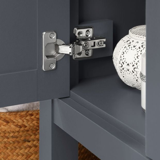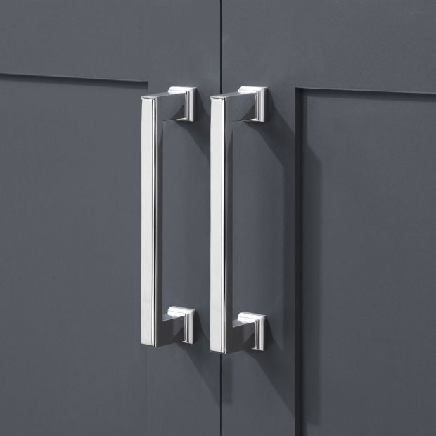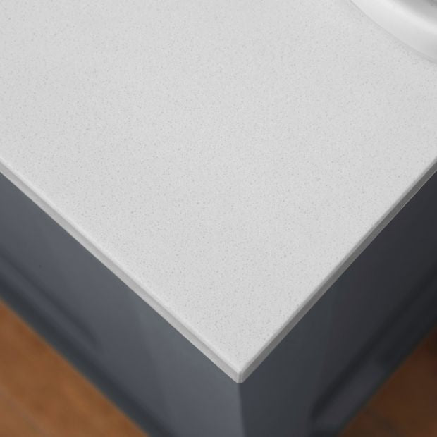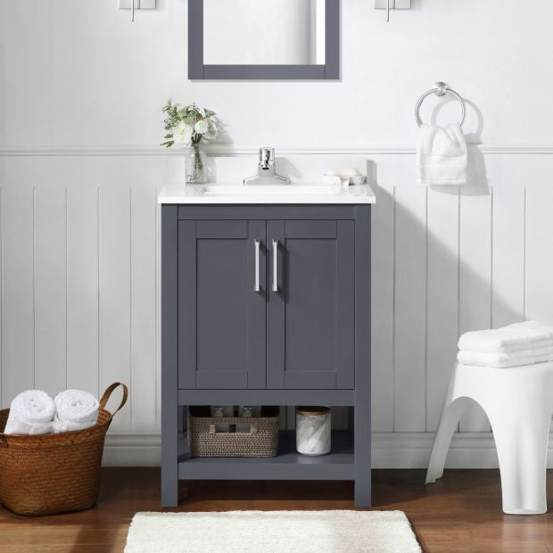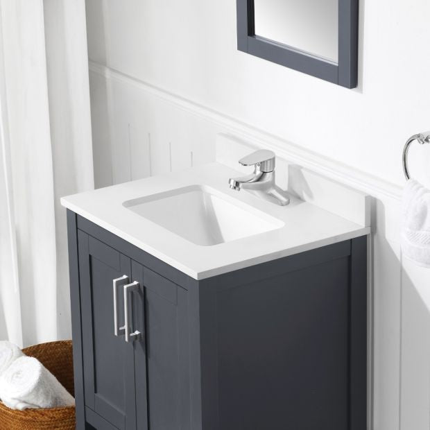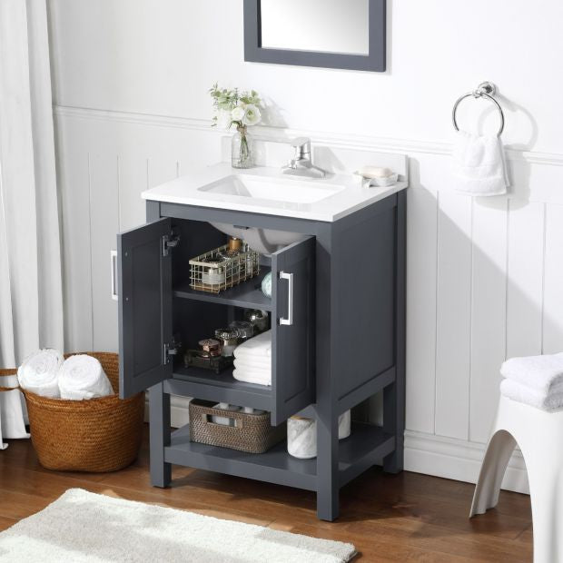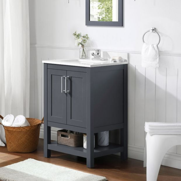 Let the handsome charms of the 24" wide vanity sweep you off your feet. Its sophisticated dark charcoal finish introduces a cool neutral touch to your bathroom decor, with modern polished chrome hardware and chic panelling adding a stately presence. A two-door cabinet with soft-close hinges plus an adjustable shelf keeps essentials hidden away in tight confines like powder rooms, while an open bottom shelf is perfect for a spa-like display of towels or decorative baskets. A contemporary crisp white engineered stone countertop with a generous 3" high backsplash and under-mount rectangular sink brings the final flourish.