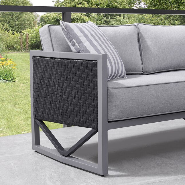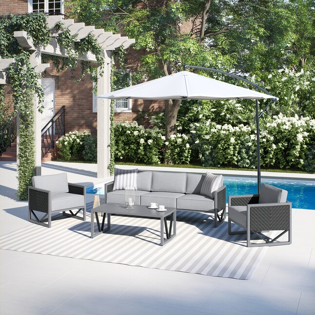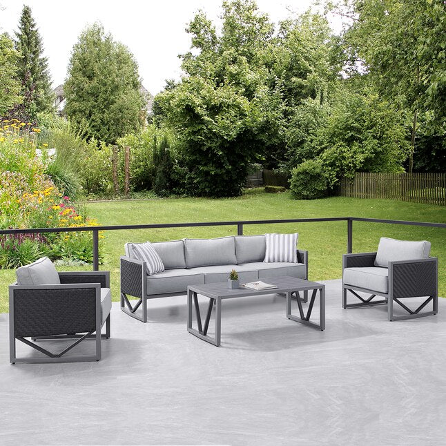 The Venti patio conversation set from OVE Decors combines functional furniture with rustic-inspired decor throws, resulting in a beautiful outdoor set that’s primed for regular hosting and socializing. Each of the four pieces is constructed from a sturdy grey aluminum frame, and the set is complemented beautifully with dark grey wicker accents and a slatted coffee table design. The comfortable cushions are made from fade- and weather-resistant Olefin® material, while each piece also features levelling feet ensuring safe and secure use on all surfaces.