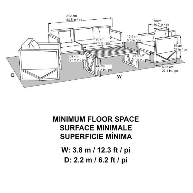 - Sofa dimensions (W × D × H): 212 cm × 69.5 cm × 61 cm (83.5-in × 27.4-in × 24-in) Chair dimensions (W × D × H): 78 cm × 69.5 cm × 61 cm (30.7-in × 27.4-in × 24-in) Table dimensions (W × D × H): 120 cm × 59 cm × 44 cm (47.2 × 23.2-in × 17.3-in)