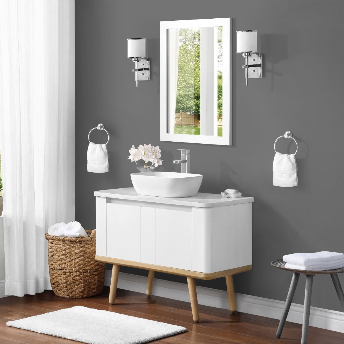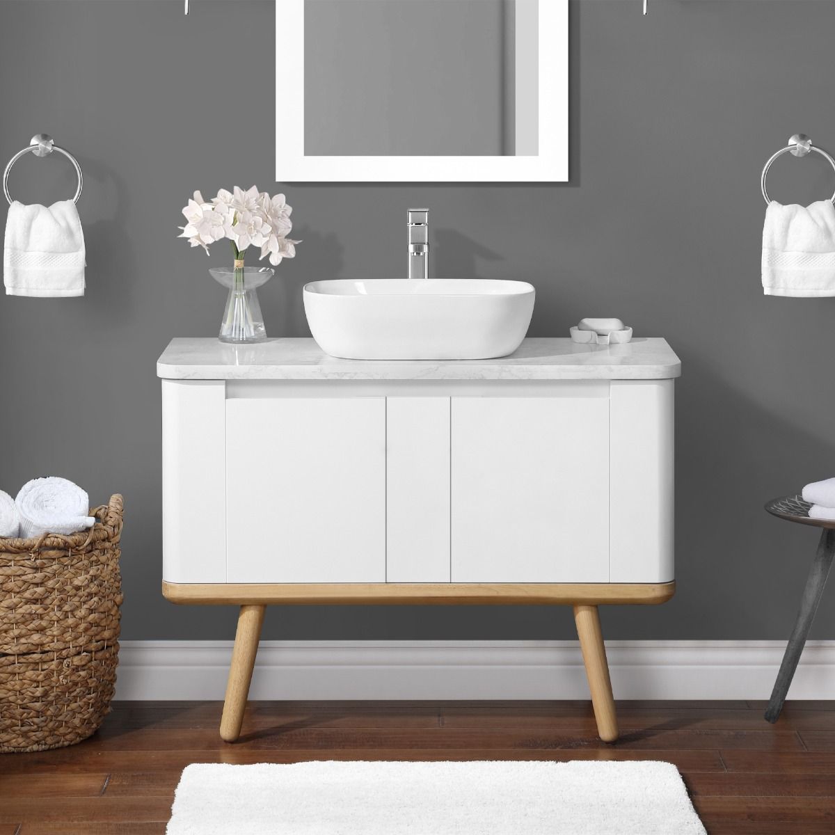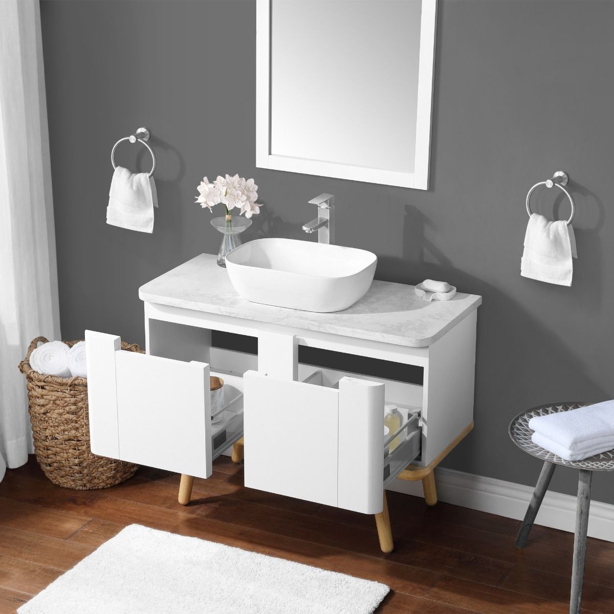 Bring a breath of fresh air into your bathroom design with the elegantly contemporary Zayden 40 in. wide vanity by OVE Decors Collection. A minimalist white lacquered finish adorns the finely built curved ends cabinetry, offering two modern spacious drawers with integrated handles on mid-century inspired angled legs. A gorgeous white ceramic vessel sink rests on a double thick slab of cultured marble with a rounded edge profile. Also available in a lively Spring Green finish plus a 60 in. wide double vanity option for his and hers flexibility.