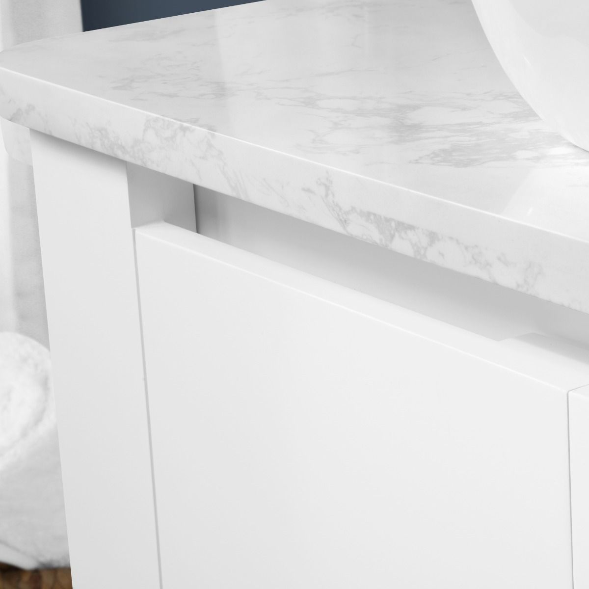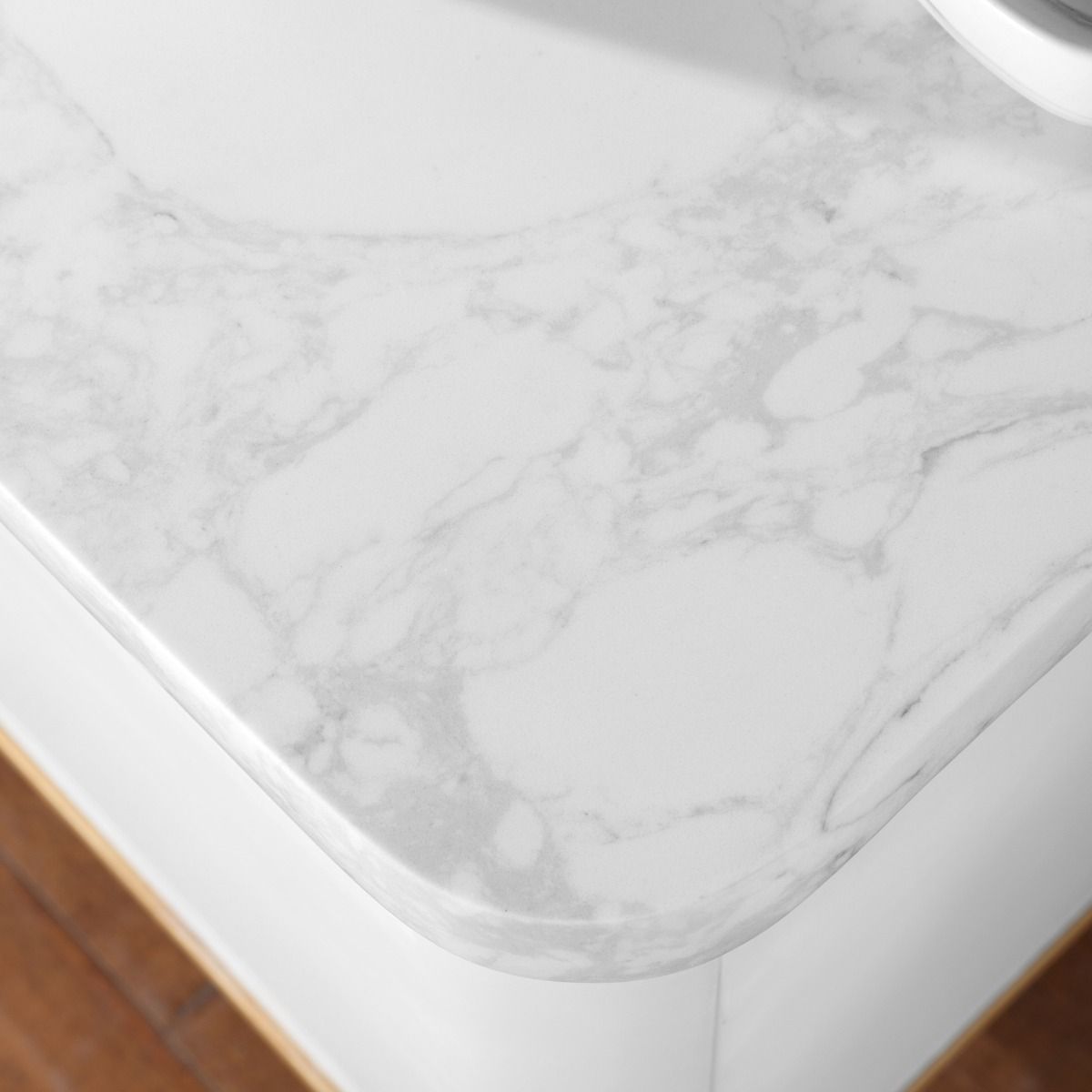 - White with gray veins cultured marble countertop in a double thick slab with round edge